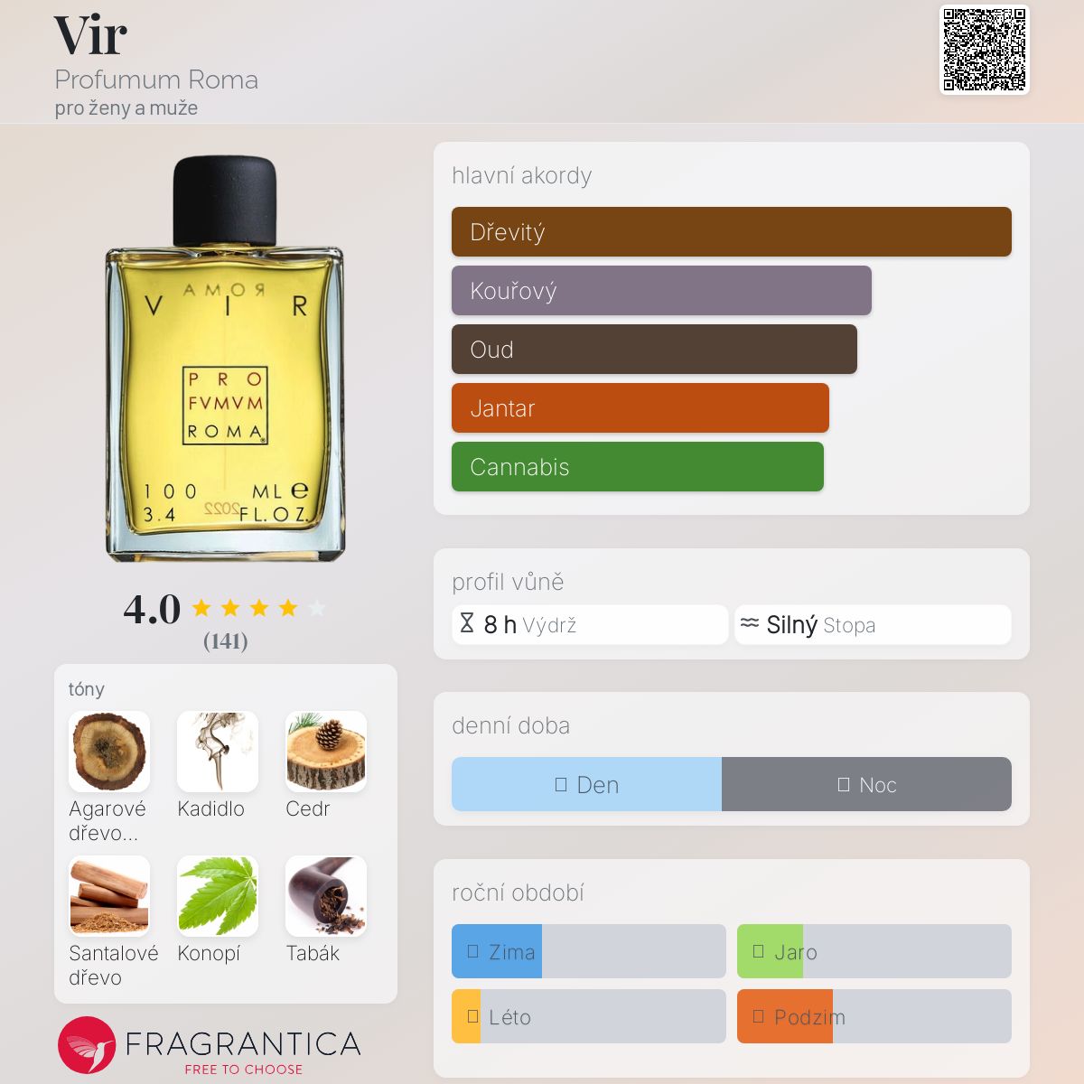 Vir podle Profumum Roma je Woody Aromatic vůně pro ženy a muže. Toto je nová vůně. Vir byl/a uveden/a v roce 2022. Vrchní tón je Konopí ; střední tóny jsouCedr, Santalové dřevo a Tabákový list ; základní tóny jsou Agarové dřevo (oud) a Kadidlo.