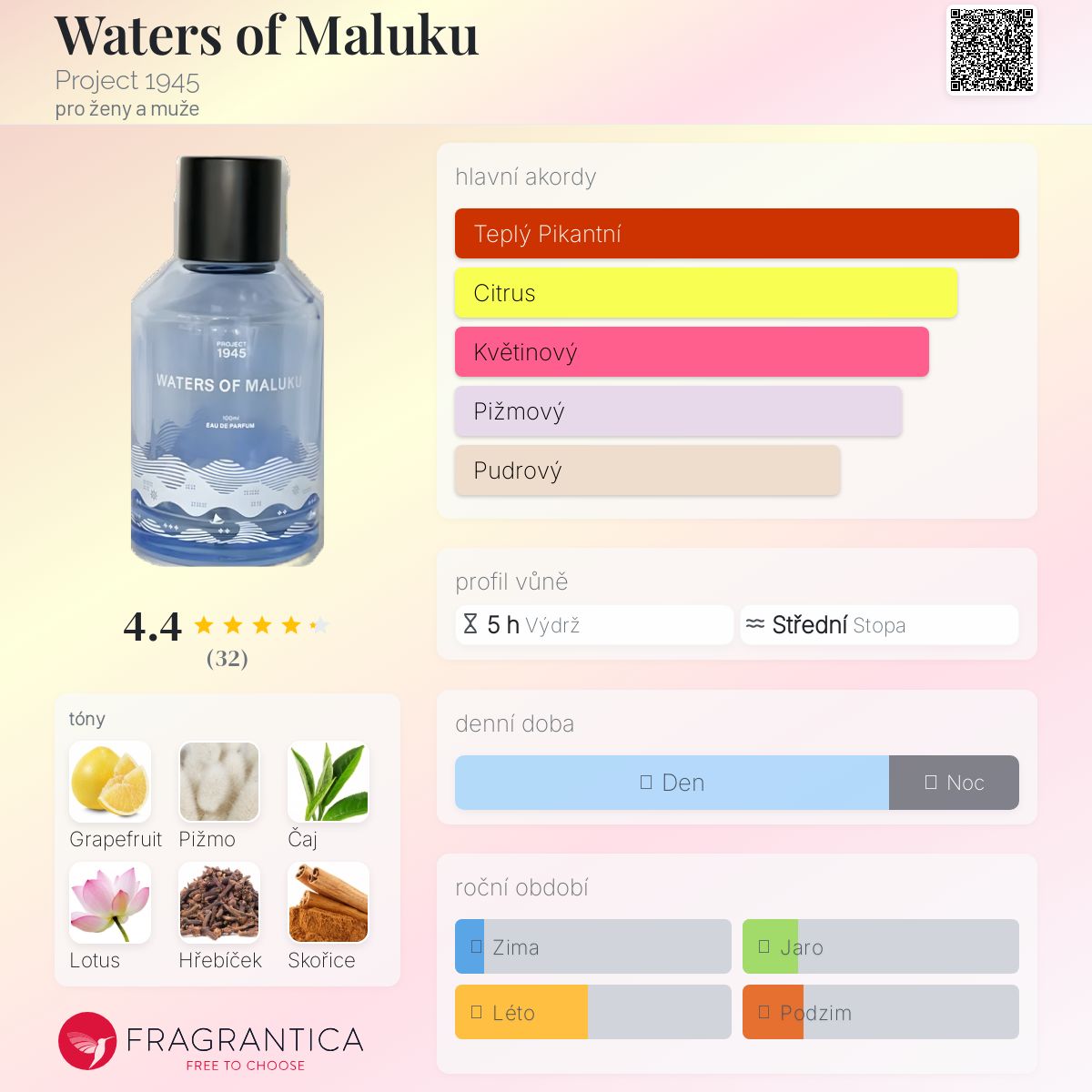 Waters of Maluku podle Project 1945 je vůně pro ženy a muže. Toto je nová vůně. Waters of Maluku byl/a uveden/a v roce 2022. Vrchní tóny jsou Grapefruit, Zelený čaj a Mrkev; střední tóny jsouLotus, Skořice a Pivoňka ; základní tóny jsou Pižmo, Hřebíček, Kadidlo a Labdanum.