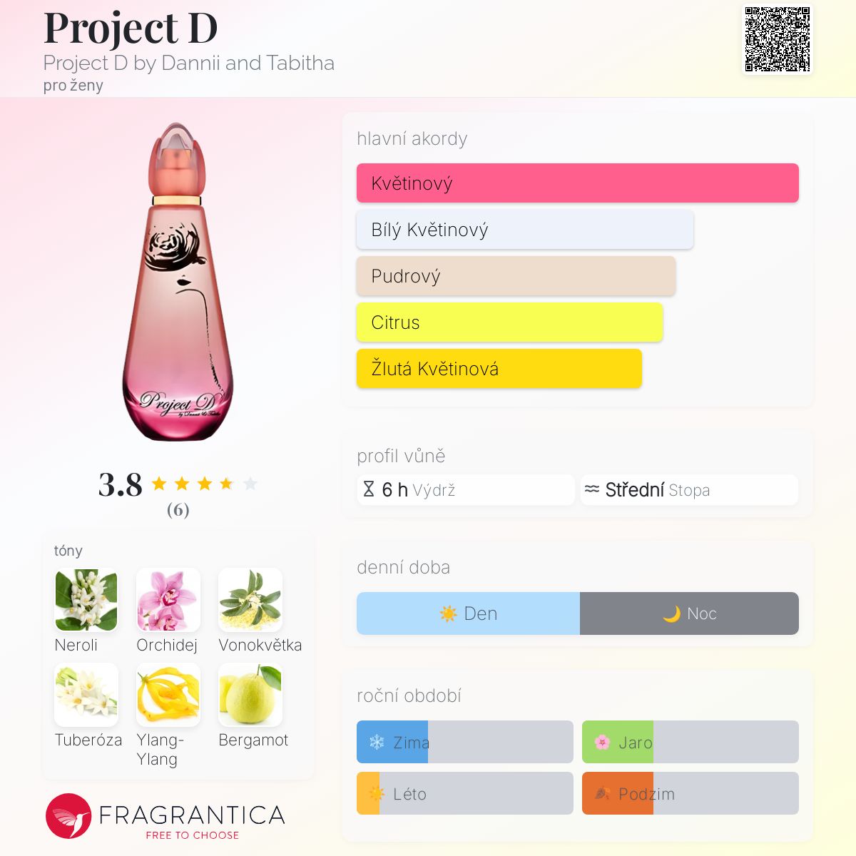 Project D podle Project D by Dannii and Tabitha je Floral vůně pro ženy. Project D byl/a uveden/a v roce 2010. Vrchní tóny jsou Neroli, Ylang-Ylang a Bergamot; střední tóny jsouOrchidej, Vonokvětka, Tuberóza a Mimóza ; základní tóny jsou Pižmo, Santalové dřevo, Jantar (ambra) a Šafrán.