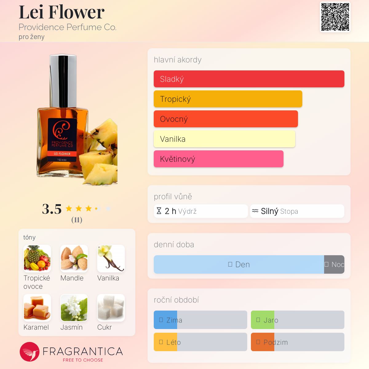 Lei Flower podle Providence Perfume Co. je Floral Fruity vůně pro ženy. Lei Flower byl/a uveden/a v roce 2010. "Nosem" za touto vůní je Charna Ethier. Vrchní tóny jsou Tropické ovoce, Karamel, Pomeranč, Heřmánek, Yuzu a Estragon; střední tóny jsouMandle, Jasmín, Cukr, Plumérie a Ylang-Ylang ; základní tóny jsou Vanilka, Pačuli, Kakao, Kokos a Černý rybíz.