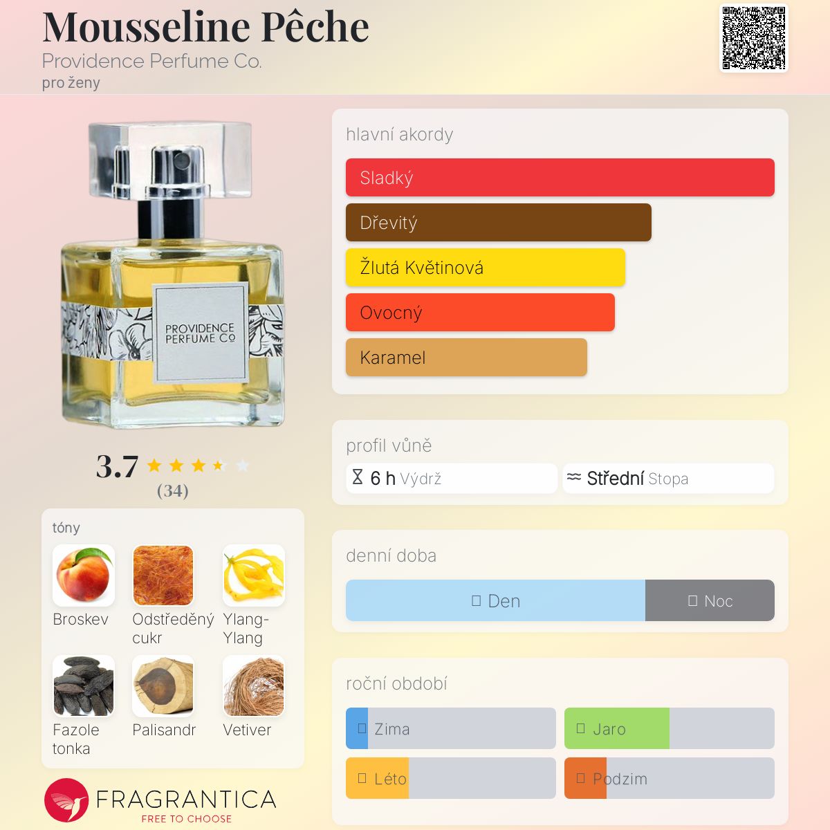 Mousseline Pêche podle Providence Perfume Co. je Floral Fruity vůně pro ženy. Mousseline Pêche byl/a uveden/a v roce 2013. "Nosem" za touto vůní je Charna Ethier. Vrchní tóny jsou Palisandr, Yuzu a Růžový grapefruit; střední tóny jsouBroskev, Ylang-Ylang a Růže ; základní tóny jsou Odstředěný cukr, Fazole tonka a Vetiver.