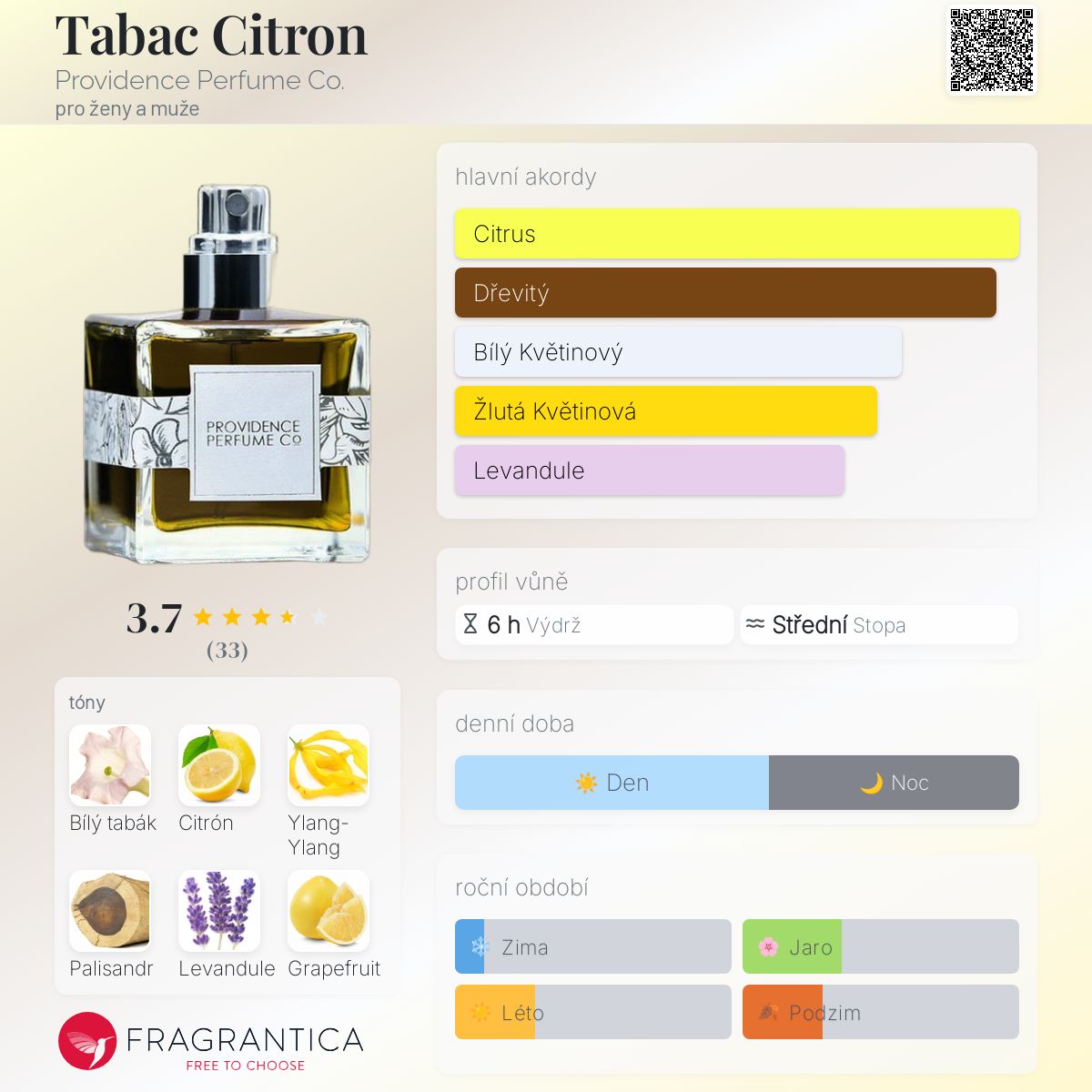 Tabac Citron podle Providence Perfume Co. je Citrus Aromatic vůně pro ženy a muže. Tabac Citron byl/a uveden/a v roce 2009. "Nosem" za touto vůní je Charna Ethier. Vrchní tóny jsou Citron amalfi , Palisandr a Grapefruit; střední tóny jsouYlang-Ylang, Levandule a Růže ; základní tóny jsou Bílý tabák a Santalové dřevo.