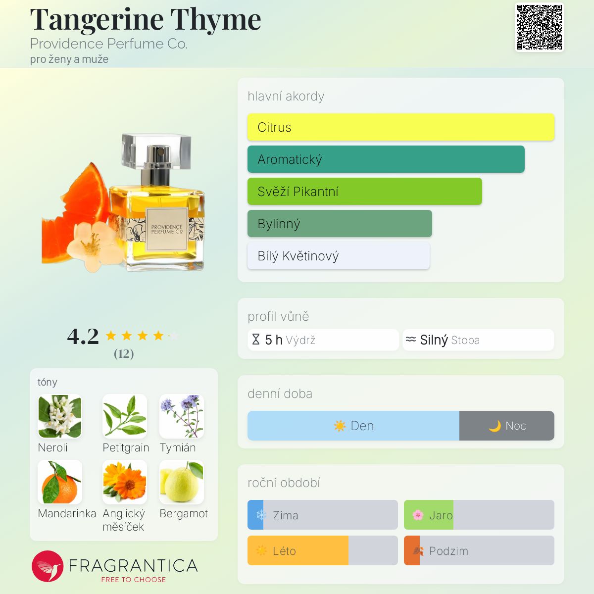 Tangerine Thyme podle Providence Perfume Co. je Citrus Aromatic vůně pro ženy a muže. Tangerine Thyme byl/a uveden/a v roce 2016. "Nosem" za touto vůní je Charna Ethier.