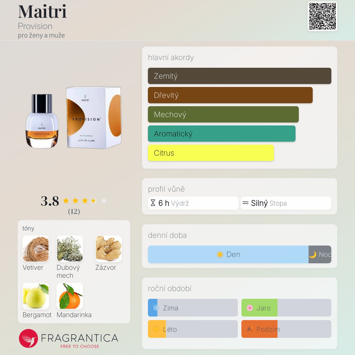 Maitri podle Provision je vůně pro ženy a muže. Maitri byl/a uveden/a v roce 2016. "Nosem" za touto vůní je Sherri Sebastian.