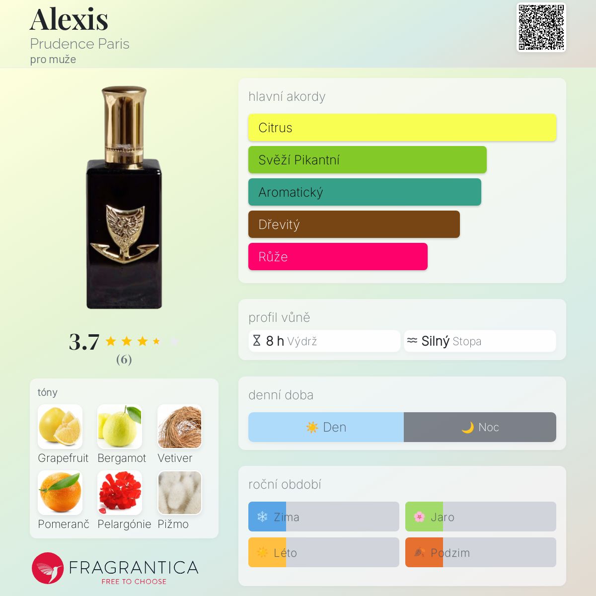 Alexis podle Prudence Paris je Woody Floral Musk vůně pro muže. Alexis byl/a uveden/a v roce 2015. Vrchní tóny jsou Grapefruit, Bergamot a Pomeranč; střední tóny jsouPelargónie, Růže, Růžový pepř, Pepř a Pačuli ; základní tóny jsou Vetiver, Pižmo, Benzoin, Cedr a Dubový mech.