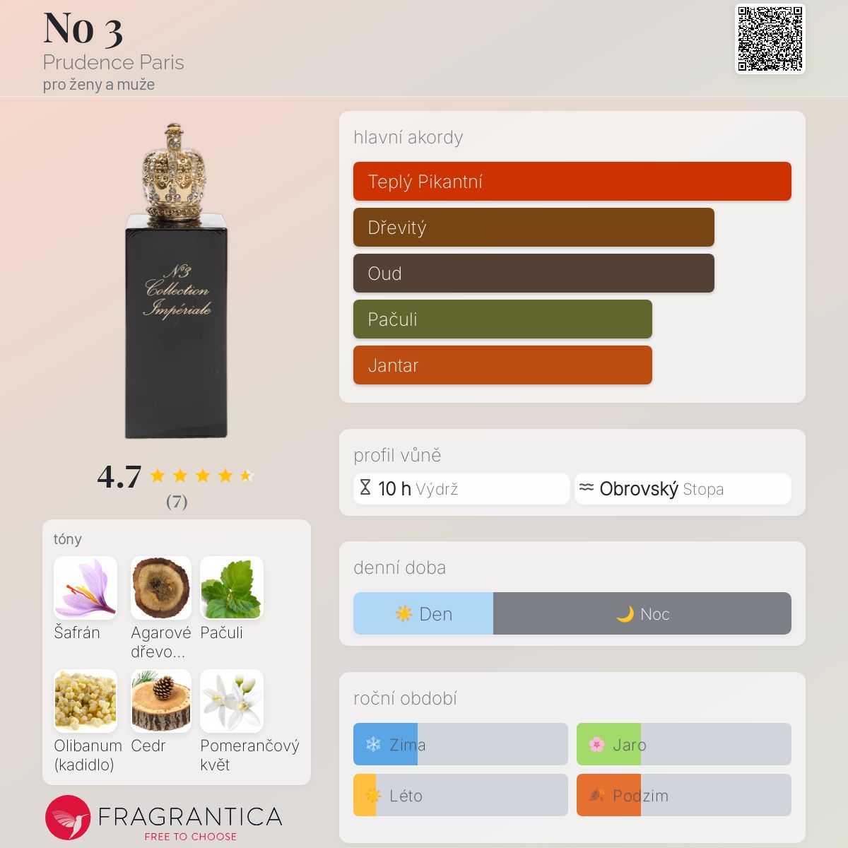 No 3 podle Prudence Paris je Orientální Floral vůně pro ženy a muže. No 3 byl/a uveden/a v roce 2015. "Nosem" za touto vůní je Prudence Kilgour. Vrchní tóny jsou Šafrán, Pomerančový květ a Červené bobule; střední tóny jsouVonokvětka, Jasmín Sambac a Hruška ; základní tóny jsou Agarové dřevo (oud), Pačuli, Olibanum, Cedr, Vanilka a Benzoin.