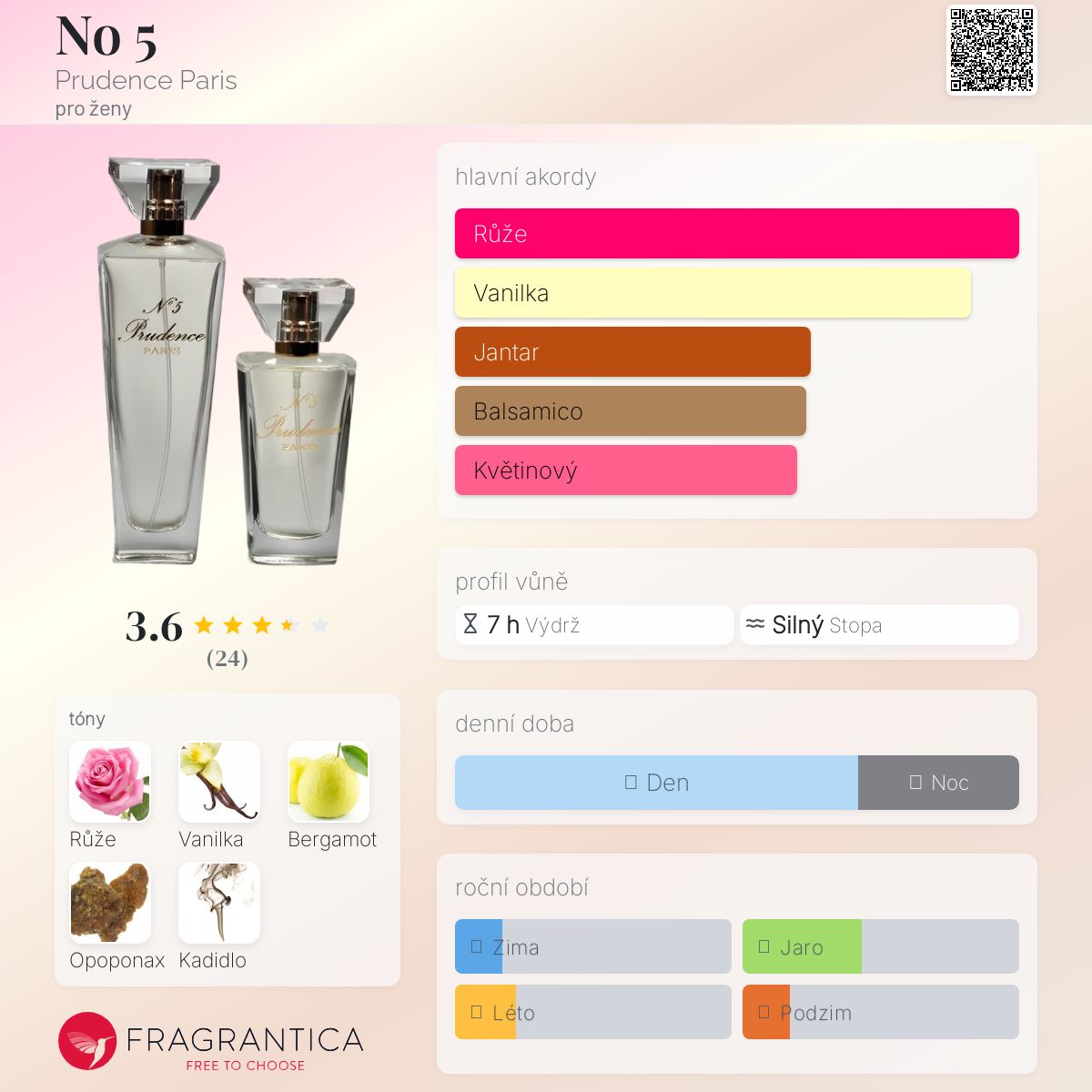 No 5 podle Prudence Paris je Floral Fruity Gourmand vůně pro ženy. No 5 byl/a uveden/a v roce 2009. "Nosem" za touto vůní je Prudence Kilgour. Vrchní tóny jsou Růže a Bergamot; střední tóny jsouRůže a Opoponax ; základní tóny jsou Vanilka a Kadidlo.