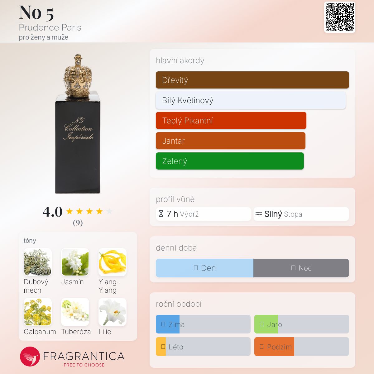 No 5 podle Prudence Paris je Orientální Floral vůně pro ženy a muže. No 5 byl/a uveden/a v roce 2015. "Nosem" za touto vůní je Prudence Kilgour. Vrchní tóny jsou Ylang-Ylang, Galbanum, Palisandr a Mandarinka; střední tóny jsouJasmín Sambac, Tuberóza, Lilie, Narcis, Karafiát a Damašská růže ; základní tóny jsou Dubový mech, Pačuli, Santalové dřevo, Olibanum, Agarové dřevo (oud), Jantar (ambra), Benzoin a Vanilka.