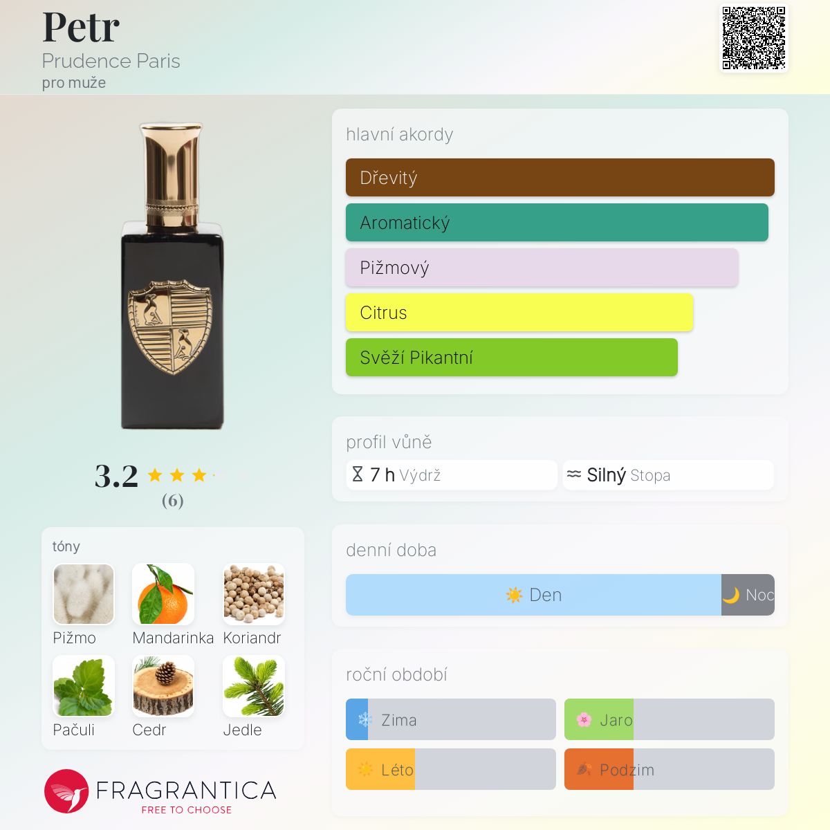Petr podle Prudence Paris je Aromatic Spicy vůně pro muže. Petr byl/a uveden/a v roce 2015. Vrchní tóny jsou Mandarinka, Zedrát, Levandule, Bazalka, Sporýš a Máta peprná; střední tóny jsouKoriandr, Andělika, Skořice a Růžový pepř ; základní tóny jsou Pižmo, Pačuli, Cedr, Jedle balzámová, Dubový mech a Vetiver.