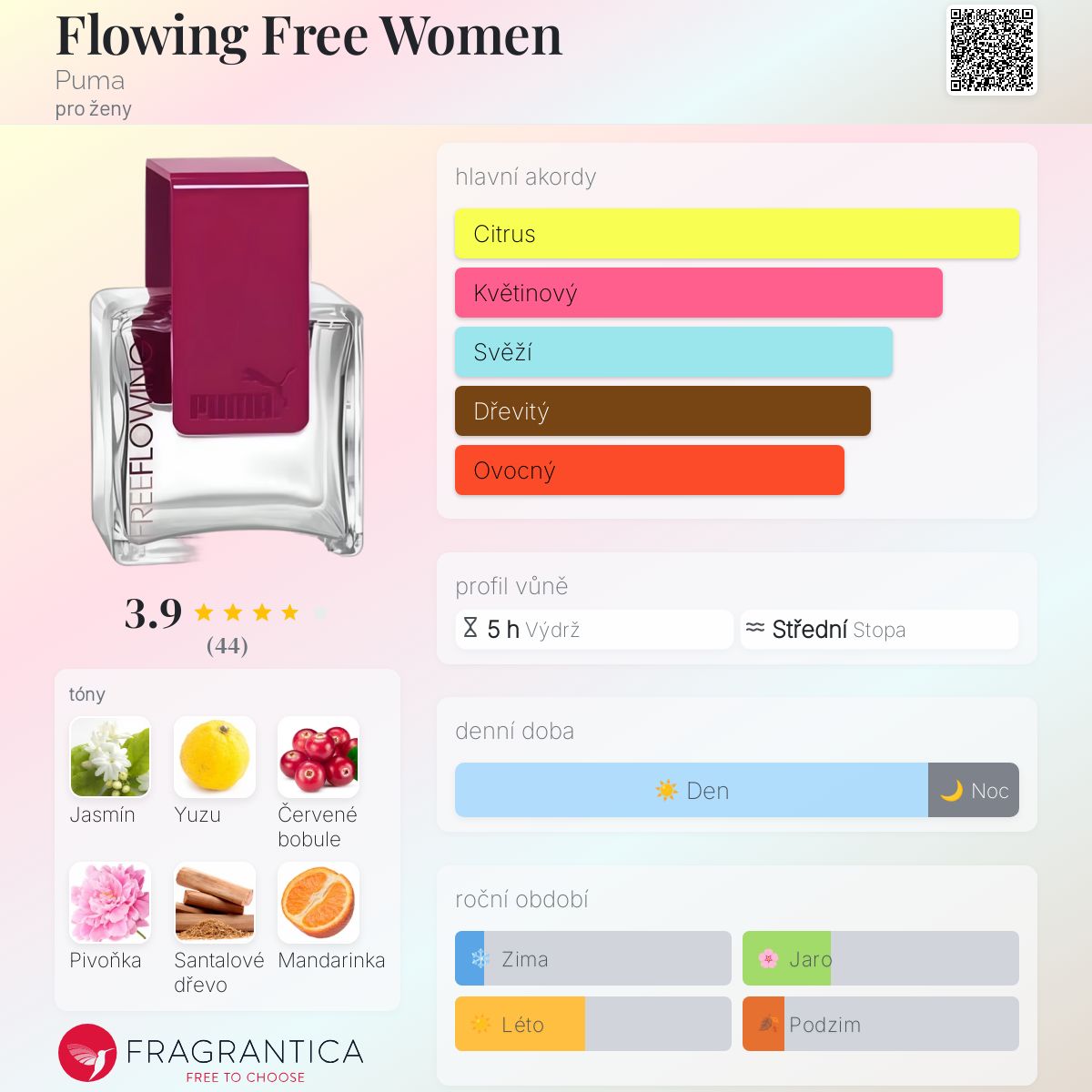Flowing Free Women podle Puma je Floral vůně pro ženy. Flowing Free Women byl/a uveden/a v roce 2008. Vrchní tóny jsou Yuzu, Červené bobule, Mandarinka a Citrusy; střední tóny jsouJasmín, Pivoňka a Lotus ; základní tóny jsou Santalové dřevo, Pižmo, Mandloň a Jantar (ambra).