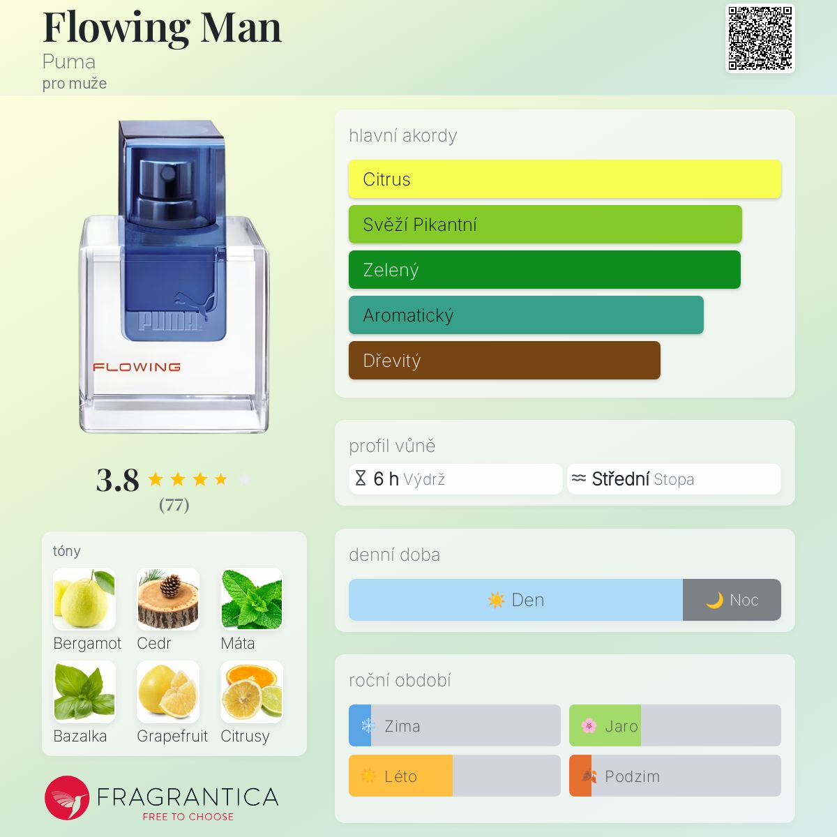 Flowing Man podle Puma je Orientální Fougere vůně pro muže. Flowing Man byl/a uveden/a v roce 2003. Vrchní tóny jsou Bergamot, Máta, Růžový grapefruit a Zelené tóny; střední tóny jsouCedr, Bazalka a Citrusy ; základní tóny jsou Pižmo a Pačuli.