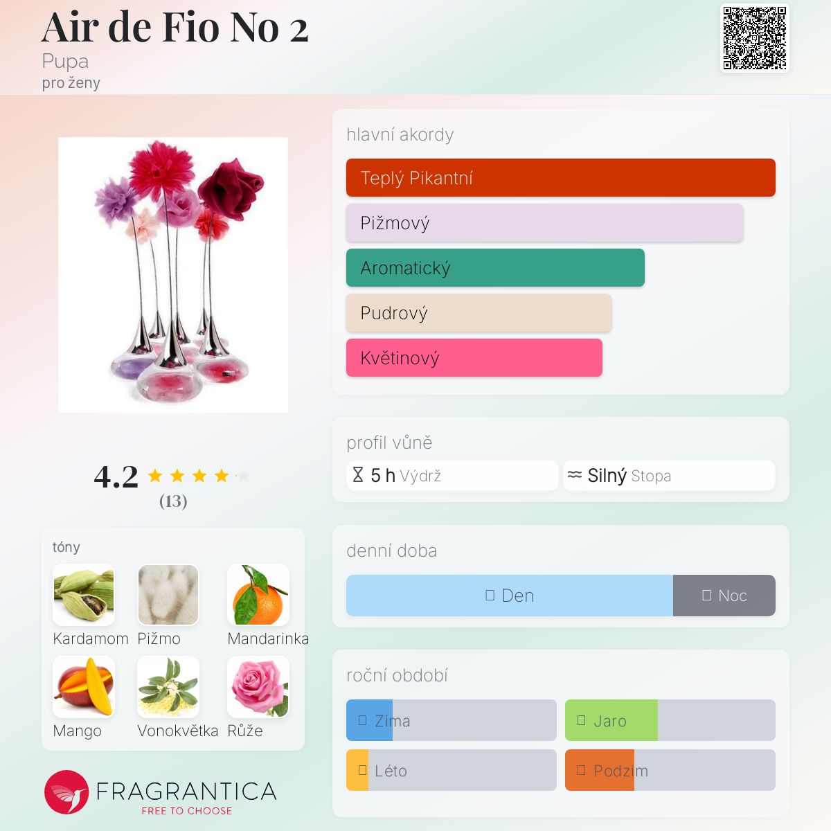 Air de Fio No 2 podle Pupa je Floral vůně pro ženy. Air de Fio No 2 byl/a uveden/a v roce 2011. Vrchní tóny jsou Mandarinka a Mango; střední tóny jsouKardamom, Vonokvětka a Růže ; základní tóny jsou Pižmo, Pačuli a Ambrette (přírodní pižmo).
