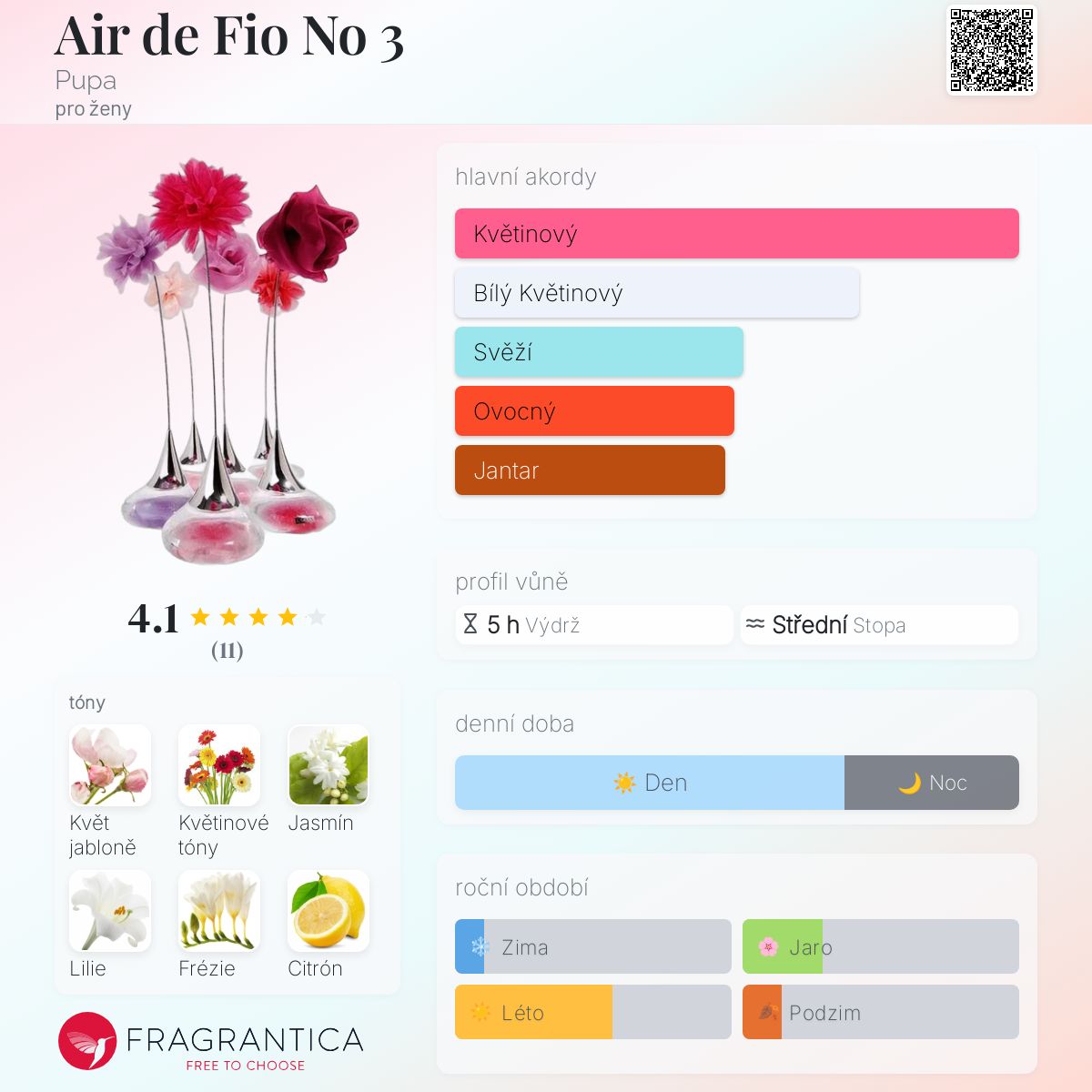 Air de Fio No 3 podle Pupa je Floral vůně pro ženy. Air de Fio No 3 byl/a uveden/a v roce 2011. Vrchní tóny jsou Květ jabloně , Frézie a Citron amalfi; střední tóny jsouKvětinové tóny, Jasmín a Lilie ; základní tóny jsou Pižmo, Virginský cedr a Jantar (ambra).