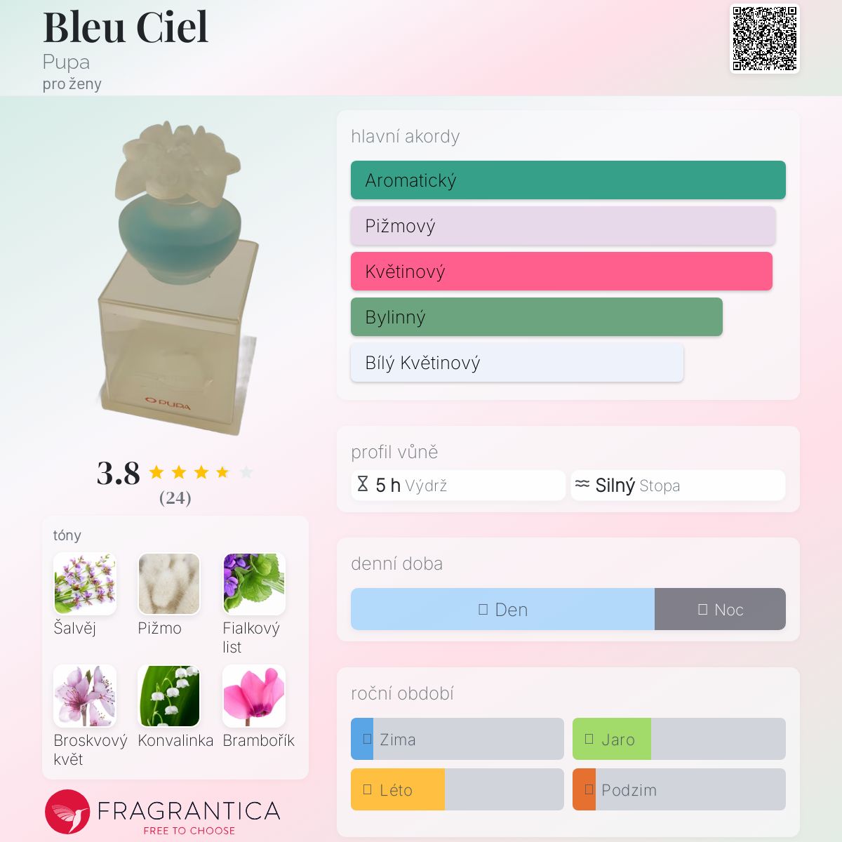 Bleu Ciel podle Pupa je Floral Green vůně pro ženy. Bleu Ciel byl/a uveden/a v roce 1998. Vrchní tóny jsou Fialkový list a Brambořík; střední tóny jsouBroskvový květ, Konvalinka, Růže a Jasmín ; základní tóny jsou Šalvěj, Pižmo a Kardamom.