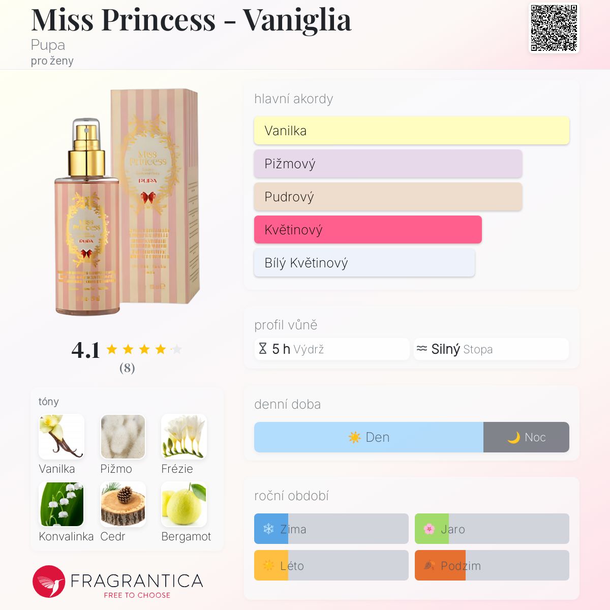 Miss Princess - Vaniglia podle Pupa je Floral Woody Musk vůně pro ženy. Vrchní tóny jsou Frézie a Bergamot; střední tóny jsouVanilka a Konvalinka ; základní tóny jsou Pižmo a Cedr.