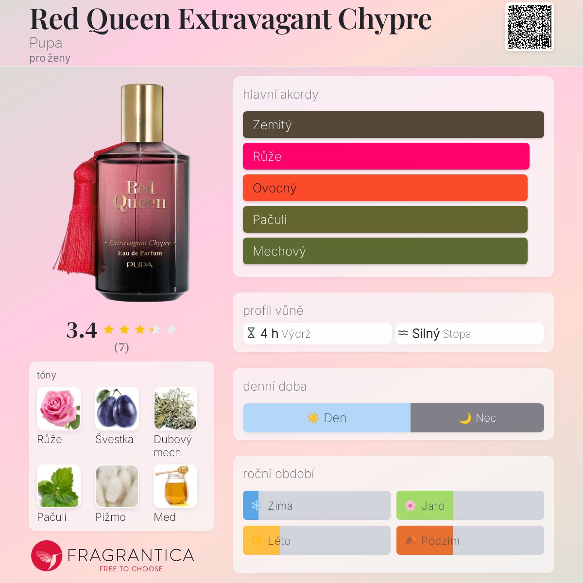 Red Queen Extravagant Chypre podle Pupa je Chypre Fruity vůně pro ženy. Red Queen Extravagant Chypre byl/a uveden/a v roce 2019. Vrchní tón je Med ; střední tóny jsouRůže, Švestka a Konvalinka ; základní tóny jsou Dubový mech, Pačuli, Pižmo, Jantar (ambra) a Vanilka.