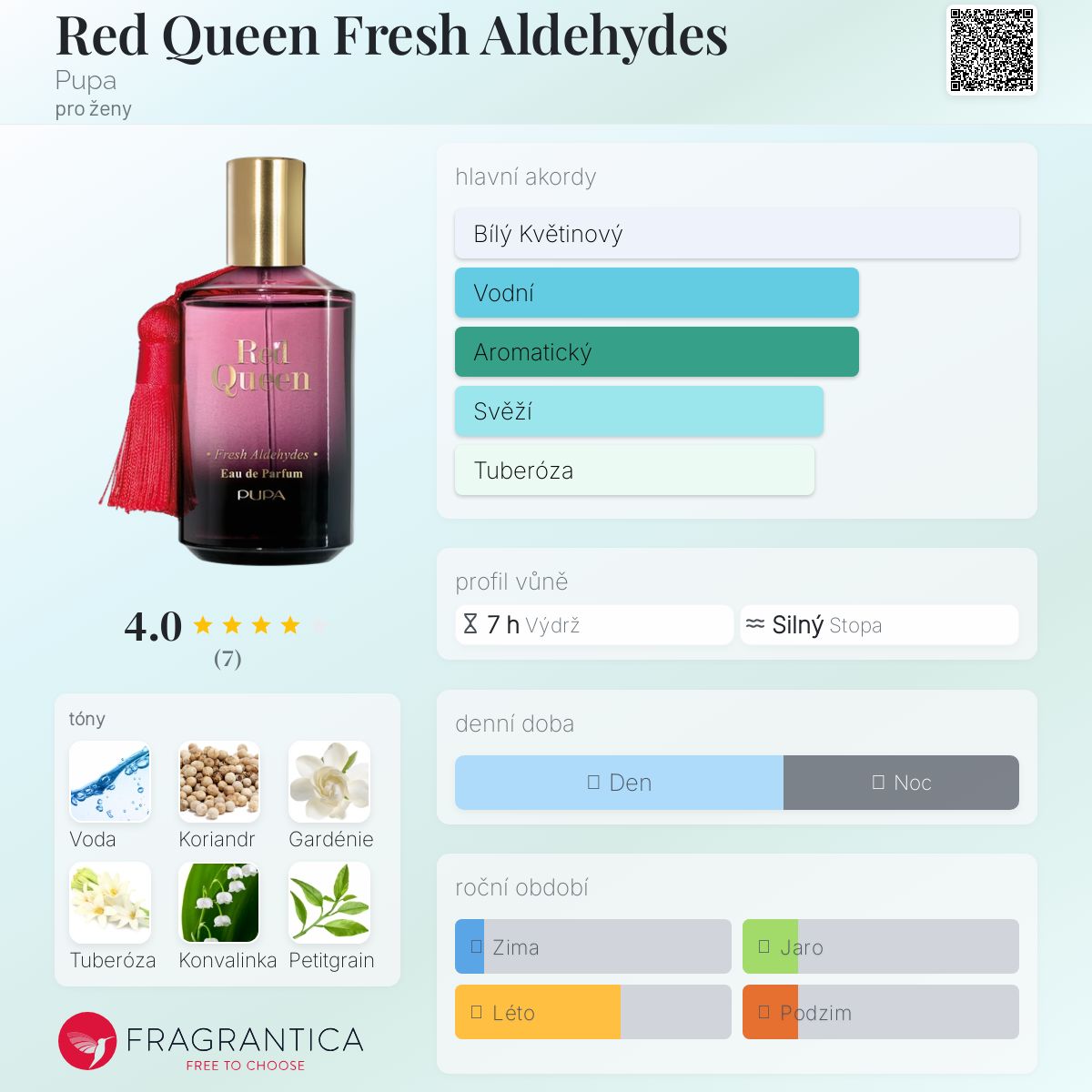 Red Queen Fresh Aldehydes podle Pupa je Floral vůně pro ženy. Red Queen Fresh Aldehydes byl/a uveden/a v roce 2019. Vrchní tóny jsou Koriandr, Pomerančový list a Rebarbora; střední tóny jsouVodní tóny, Gardénie, Tuberóza, Konvalinka a Okvětní lístky ; základní tóny jsou Vetiver, Jantar (ambra) a Bílé pižmo.