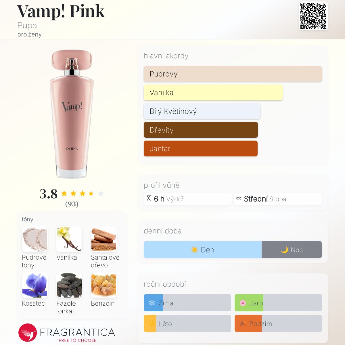 Vamp! Pink podle Pupa je Orientální Floral vůně pro ženy. Vamp! Pink byl/a uveden/a v roce 2021. "Nosem" za touto vůní je Luca Maffei. Vrchní tóny jsou Jasmín, Květ tiare a Pomerančový květ; střední tóny jsouPudrové tóny, Fazole tonka a Květ hedvábného stromu ; základní tóny jsou Vanilka, Santalové dřevo, Kosatec a Benzoin.