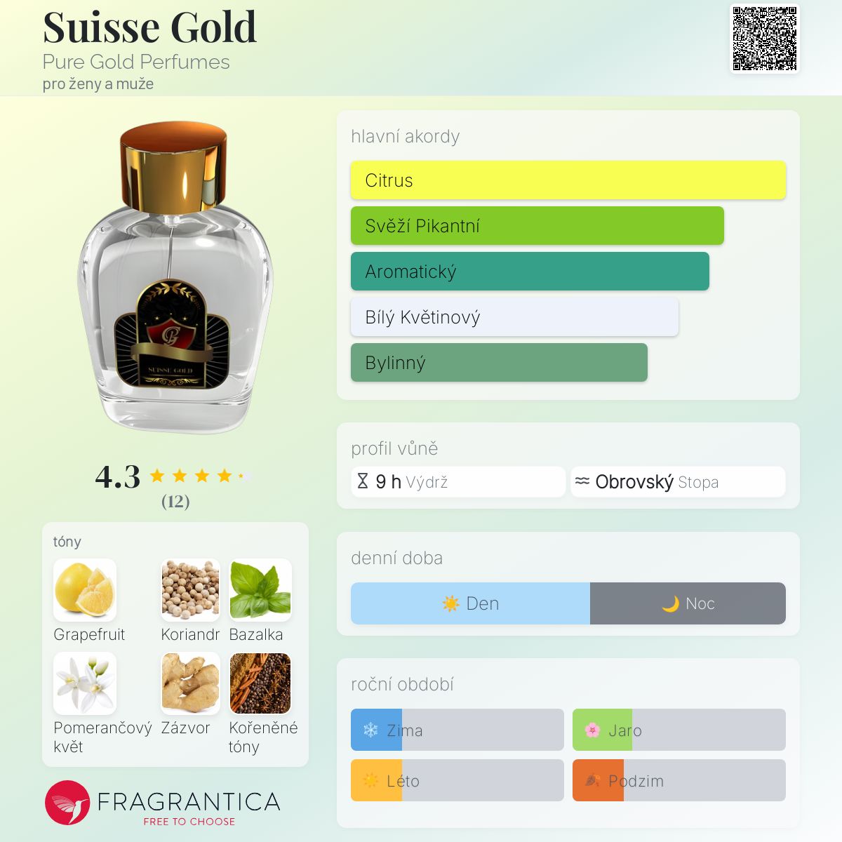 Suisse Gold podle Pure Gold Perfumes je Aromatic Spicy vůně pro ženy a muže. Suisse Gold byl/a uveden/a v roce 2016. "Nosem" za touto vůní je Urs Castelletti. Vrchní tóny jsou Grapefruit, Koriandr a Bazalka; střední tóny jsouPomerančový květ, Zázvor a Kardamom ; základní tóny jsou Kořeněné tóny, Jantar (ambra) a Tabák.