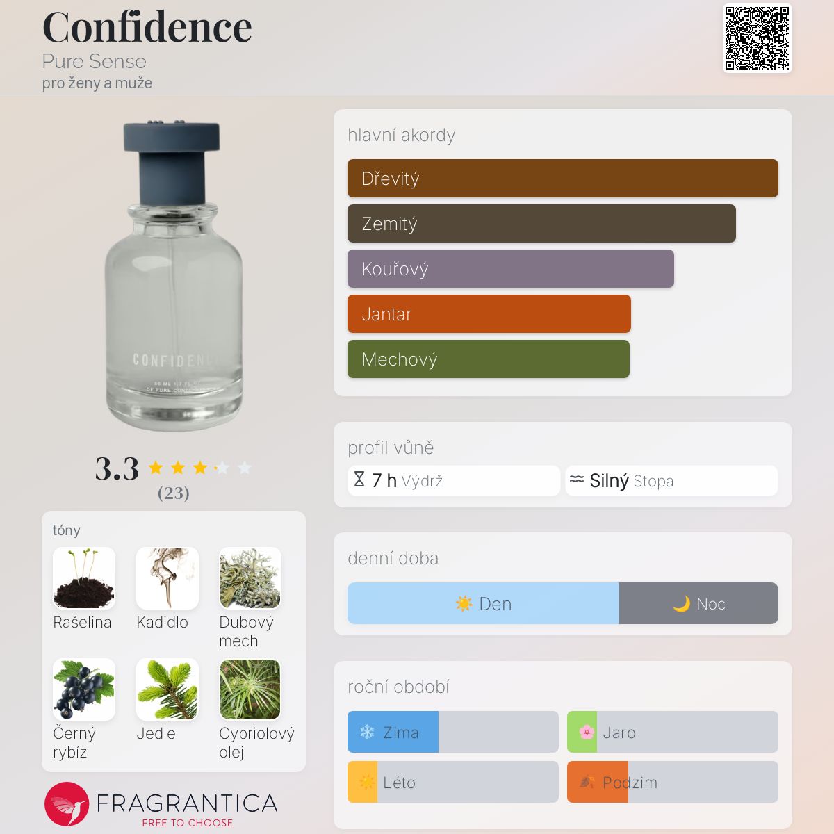 Confidence podle Pure Sense je Woody Aromatic vůně pro ženy a muže. Confidence byl/a uveden/a v roce 2024. Vrchní tóny jsou Černý rybíz, Bergamot a Kardamom; střední tóny jsouJedle a Atlasový cedr ; základní tóny jsou Rašelina, Kadidlo, Mech a Cypriolový olej.