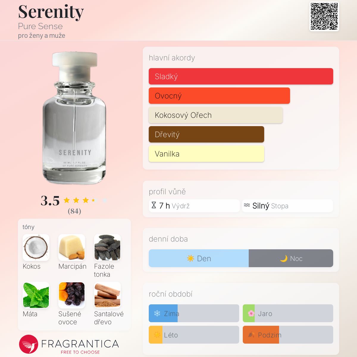 Serenity podle Pure Sense je Chypre Fruity vůně pro ženy a muže. Serenity byl/a uveden/a v roce 2020. "Nosem" za touto vůní je Alexander Yashin. Vrchní tóny jsou Máta, Pomelo, Davana a Bergamot; střední tóny jsouMarcipán, Sušené ovoce, Švestka, Lesní plody, Hrozny Pinot Noir, Skořice a Muškátový oříšek ; základní tóny jsou Kokos, Fazole tonka, Santalové dřevo a Kadidlo.