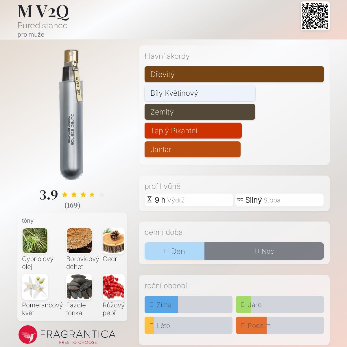 M V2Q podle Puredistance je Leather vůně pro muže. M V2Q byl/a uveden/a v roce 2022. "Nosem" za touto vůní je Antoine Lie. Vrchní tóny jsou Pomerančový květ, Růžový pepř a Levandule; střední tóny jsouCypriolový olej, Borovicový dehet, Skořice a Jasmín Sambac ; základní tóny jsou Texaský cedr, Fazole tonka, List indonéského pačuli, Španělské labdanum a Madagaskarská vanilka.
