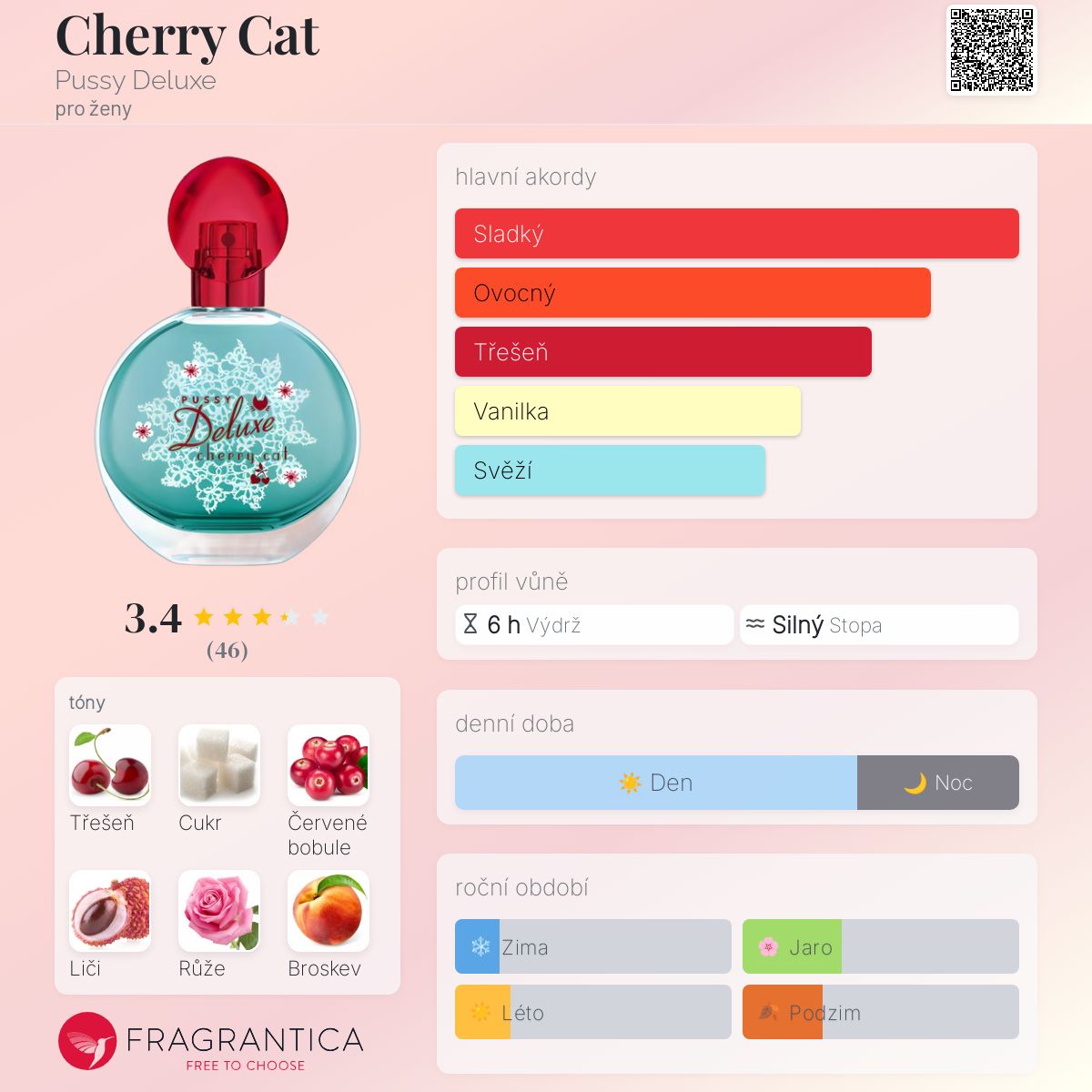 Cherry Cat podle Pussy Deluxe je Floral Fruity Gourmand vůně pro ženy. Cherry Cat byl/a uveden/a v roce 2014. Vrchní tóny jsou Třešeň, Červené bobule a Broskev; střední tóny jsouCukr, Liči, Růže a Jasmín ; základní tón je Vanilka.