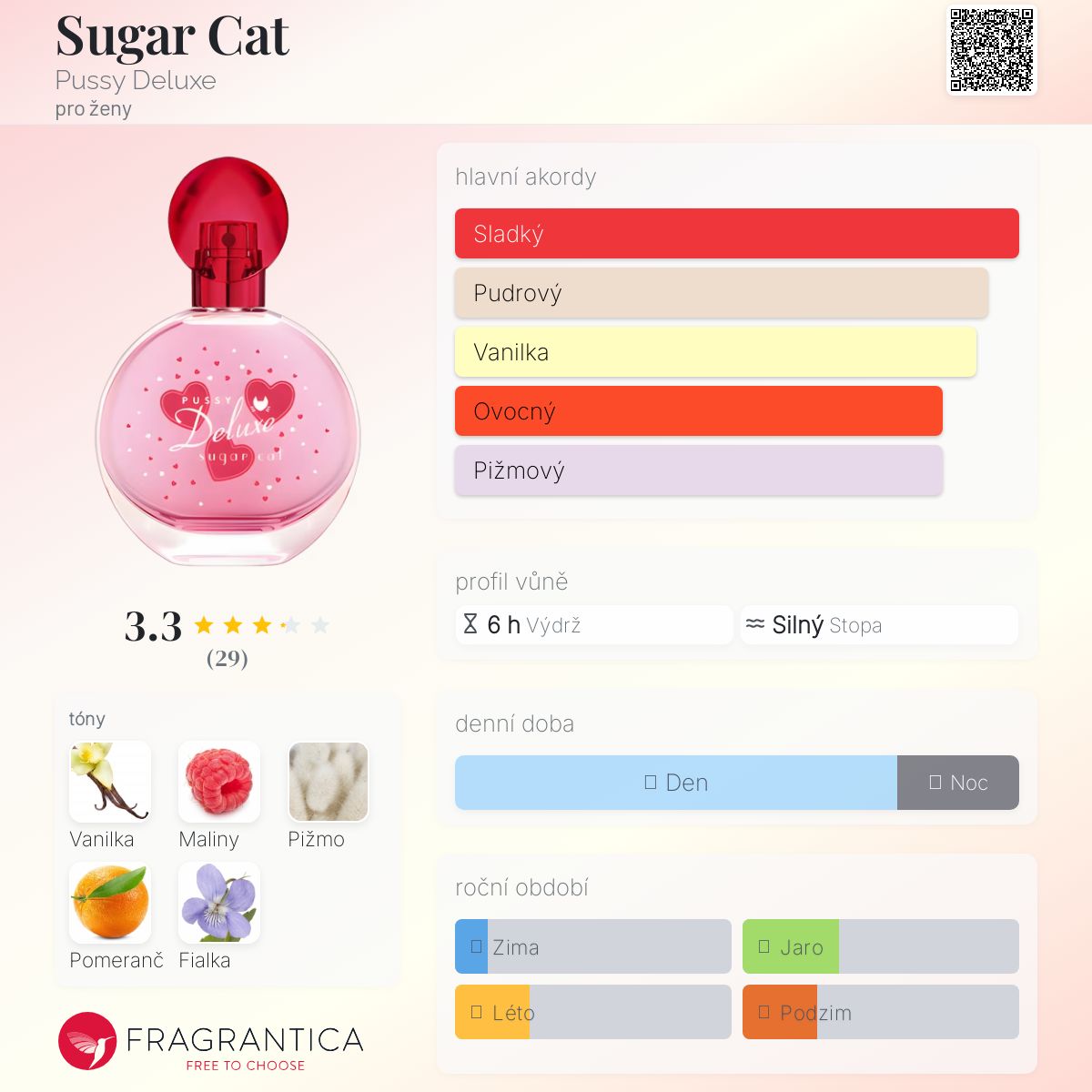 Sugar Cat podle Pussy Deluxe je Floral Fruity Gourmand vůně pro ženy. Sugar Cat byl/a uveden/a v roce 2014. Vrchní tóny jsou Maliny a Pomeranč; střední tón jeFialka ; základní tóny jsou Vanilka a Pižmo.