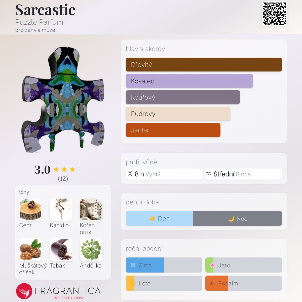 Sarcastic podle Puzzle Parfum je Orientální Woody vůně pro ženy a muže. Toto je nová vůně. Sarcastic byl/a uveden/a v roce 2024. Vrchní tóny jsou Muškátový oříšek a Andělika; střední tóny jsouKadidlo, Orris a Tabák ; základní tóny jsou Cedr a Vetiver.