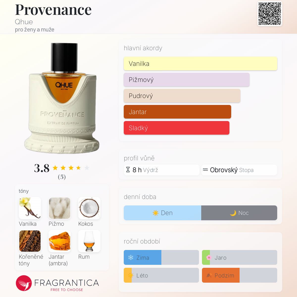 Provenance podle Qhue je Orientální Woody vůně pro ženy a muže. Toto je nová vůně. Provenance byl/a uveden/a v roce 2025. "Nosem" za touto vůní je Quentin Hernandez. Vrchní tóny jsou Kokos, Jantar (ambra) a Bergamot; střední tóny jsouKoření, Rum, Tabákový list a Kůže ; základní tóny jsou Madagaskarská vanilka, Pižmo, Exotická dřeva, Fazole tonka a Benzoin.