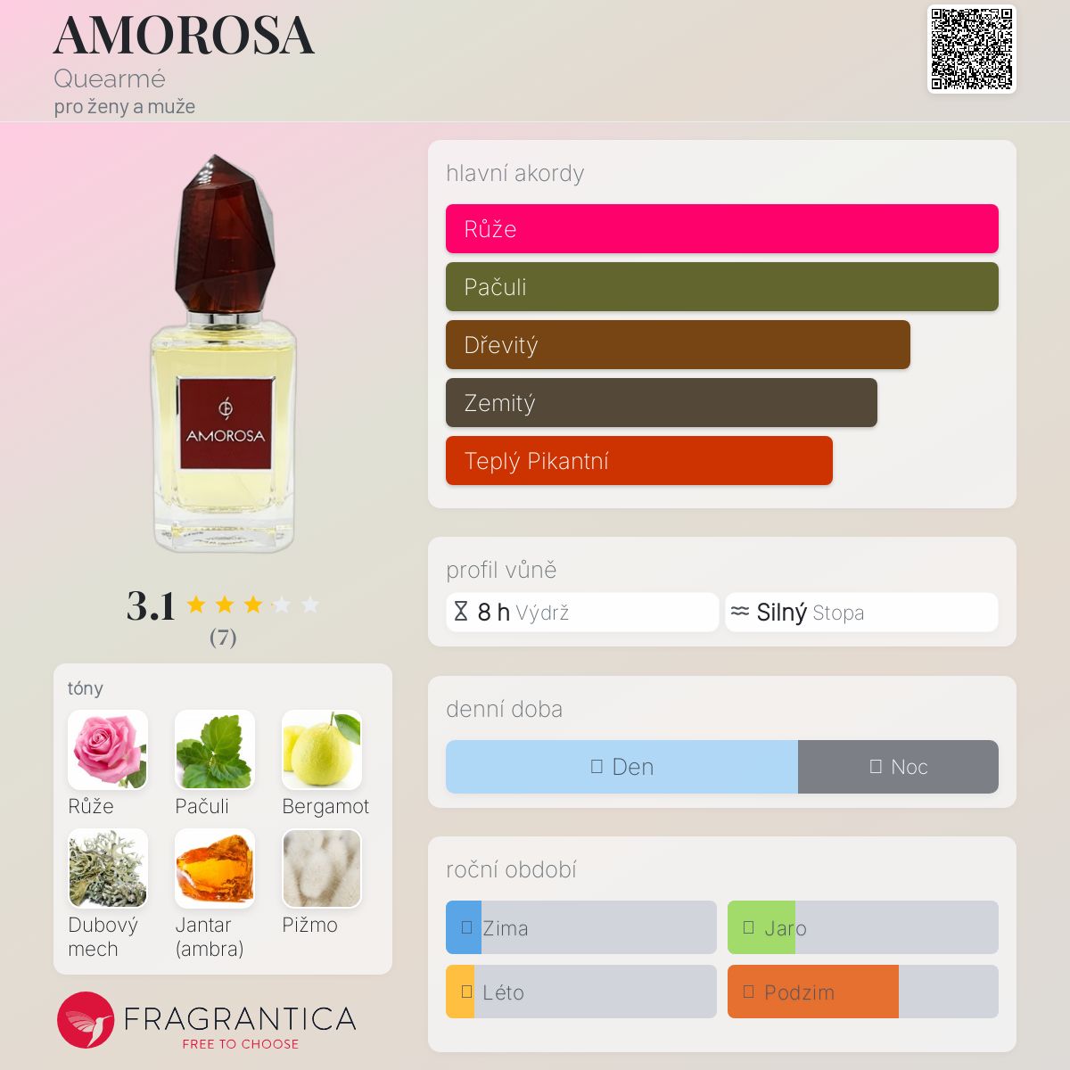 AMOROSA podle Quearmé je Woody Floral Musk vůně pro ženy a muže. AMOROSA byl/a uveden/a v roce 2021. Vrchní tóny jsou Bergamot a Pomeranč; střední tóny jsouRůže, Broskev a Jasmín ; základní tóny jsou Pačuli, Mech, Jantar (ambra) a Pižmo.