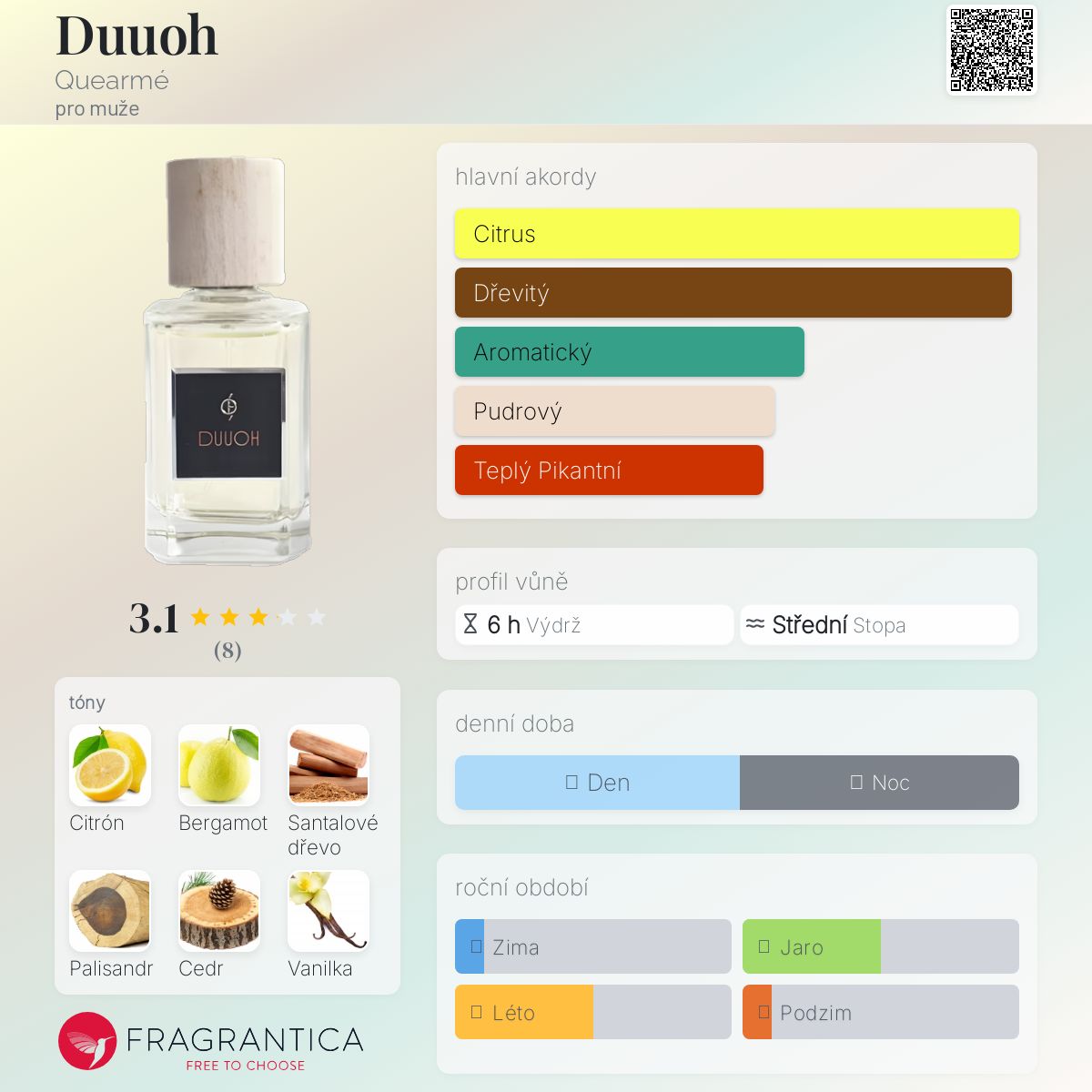 Duuoh podle Quearmé je Woody vůně pro muže. Duuoh byl/a uveden/a v roce 2021. "Nosem" za touto vůní je Caroline de Boutiny. Vrchní tóny jsou Citrón a Kalábrijský bergamot; střední tóny jsouPalisandr a Virginský cedr ; základní tóny jsou Santalové dřevo a Bourbonská vanilka.