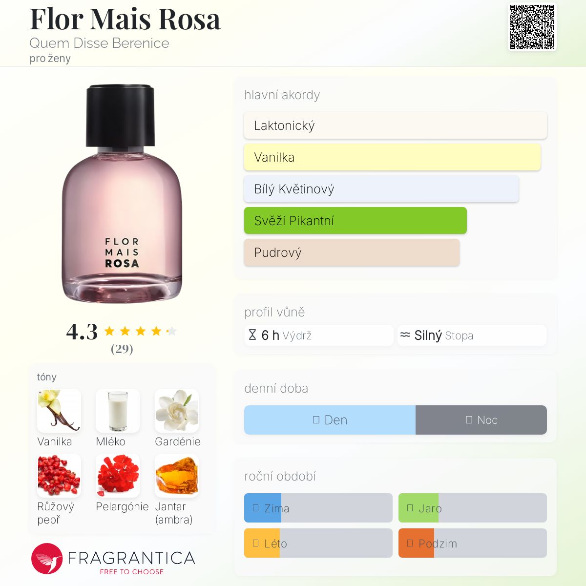 Flor Mais Rosa podle Quem Disse Berenice je Floral Fruity Gourmand vůně pro ženy. Flor Mais Rosa byl/a uveden/a v roce 2018. Vrchní tóny jsou Růžový pepř, Bergamot a Jablko; střední tóny jsouMléko, Gardénie, Pelargónie, Jasmín a Konvalinka ; základní tóny jsou Vanilka, Jantar (ambra), Cedr, Santalové dřevo a Pižmo.