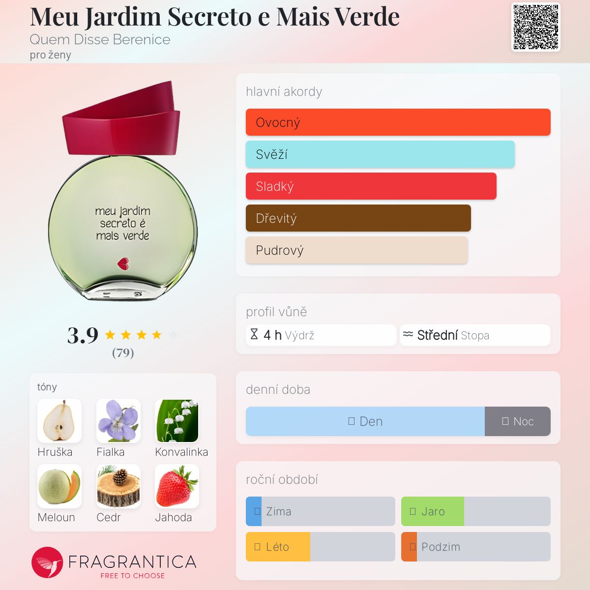 Meu Jardim Secreto e Mais Verde podle Quem Disse Berenice je Floral Green vůně pro ženy. Meu Jardim Secreto e Mais Verde byl/a uveden/a v roce 2012. Vrchní tóny jsou Hruška, Meloun a Velká jahoda; střední tóny jsouFialka, Konvalinka a Růže ; základní tóny jsou Cedr, Vanilka a Santalové dřevo.