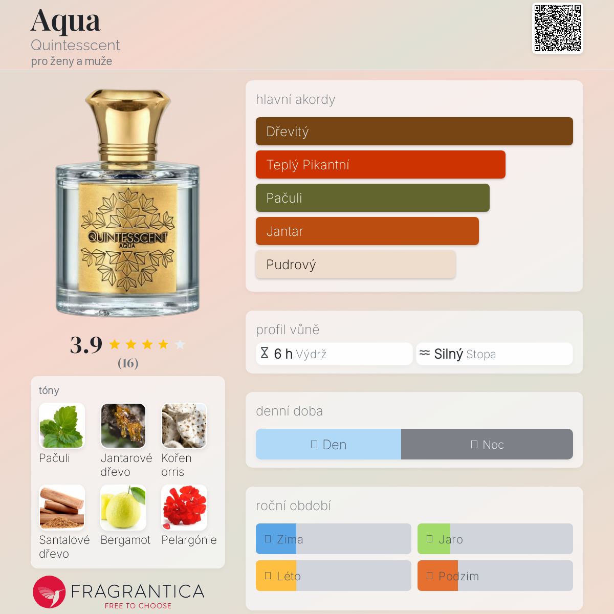 Aqua podle Quintesscent je vůně pro ženy a muže. Aqua byl/a uveden/a v roce 2018. Vrchní tóny jsou Bergamot, Pelargónie a Skořice; střední tóny jsouKořen orris, Růže a Pomerančový květ ; základní tóny jsou Pačuli, Jantarové dřevo, Santalové dřevo, Pižmo a Fazole tonka.