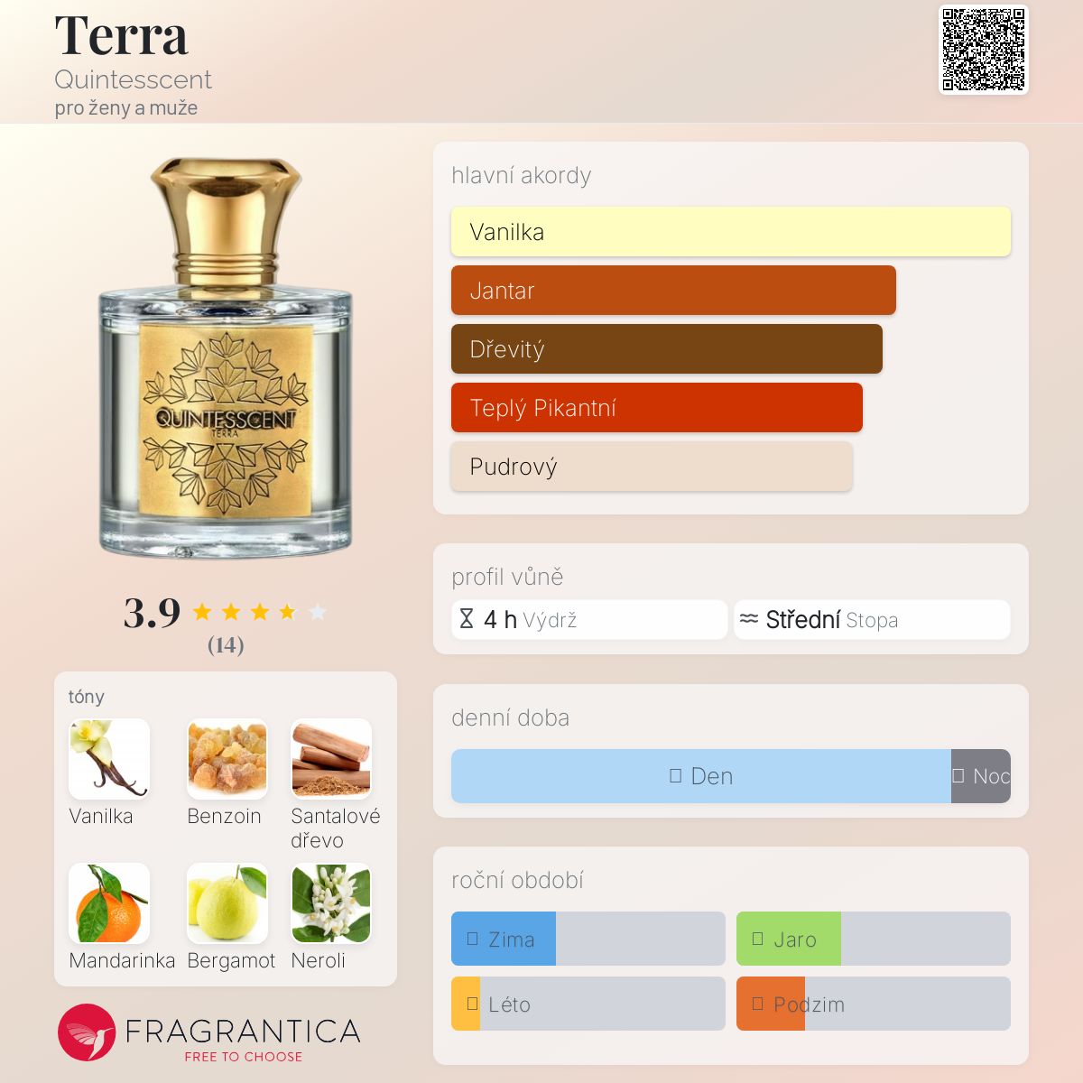 Terra podle Quintesscent je vůně pro ženy a muže. Terra byl/a uveden/a v roce 2018. Vrchní tóny jsou Mandarinka, Bergamot a Neroli; střední tóny jsouVanilka, Jasmín Sambac a Kořen orris ; základní tóny jsou Benzoin, Santalové dřevo, Pačuli a Vetiver.