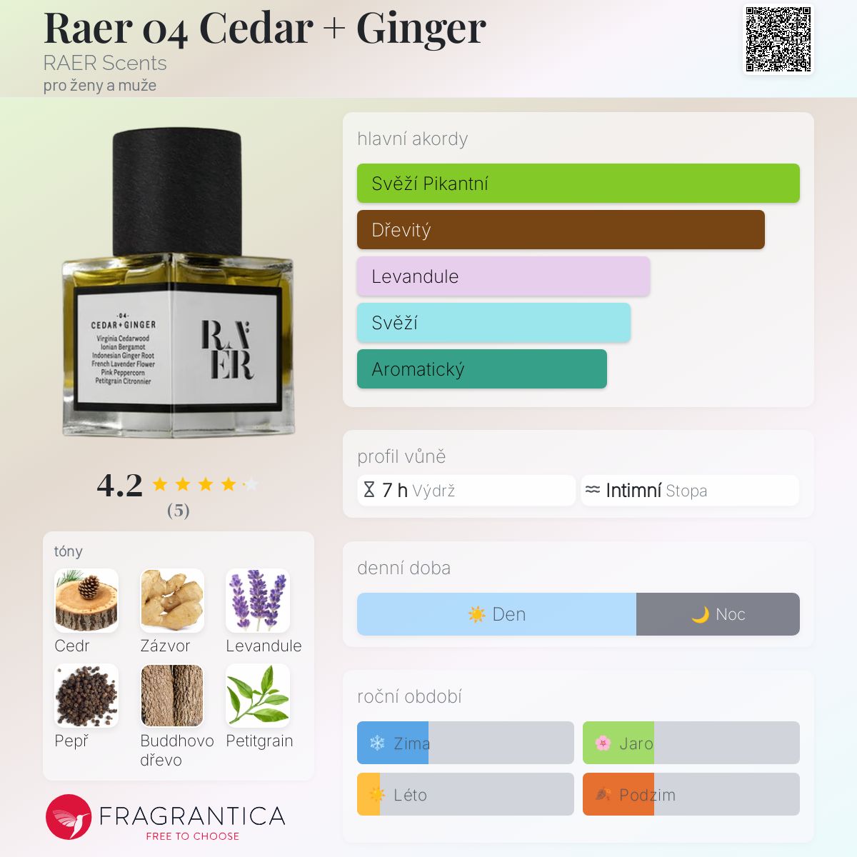 Raer 04 Cedar + Ginger podle RAER Scents je Woody Aromatic vůně pro ženy a muže. Toto je nová vůně. Raer 04 Cedar + Ginger byl/a uveden/a v roce 2024. "Nosem" za touto vůní je Ted Rohn.