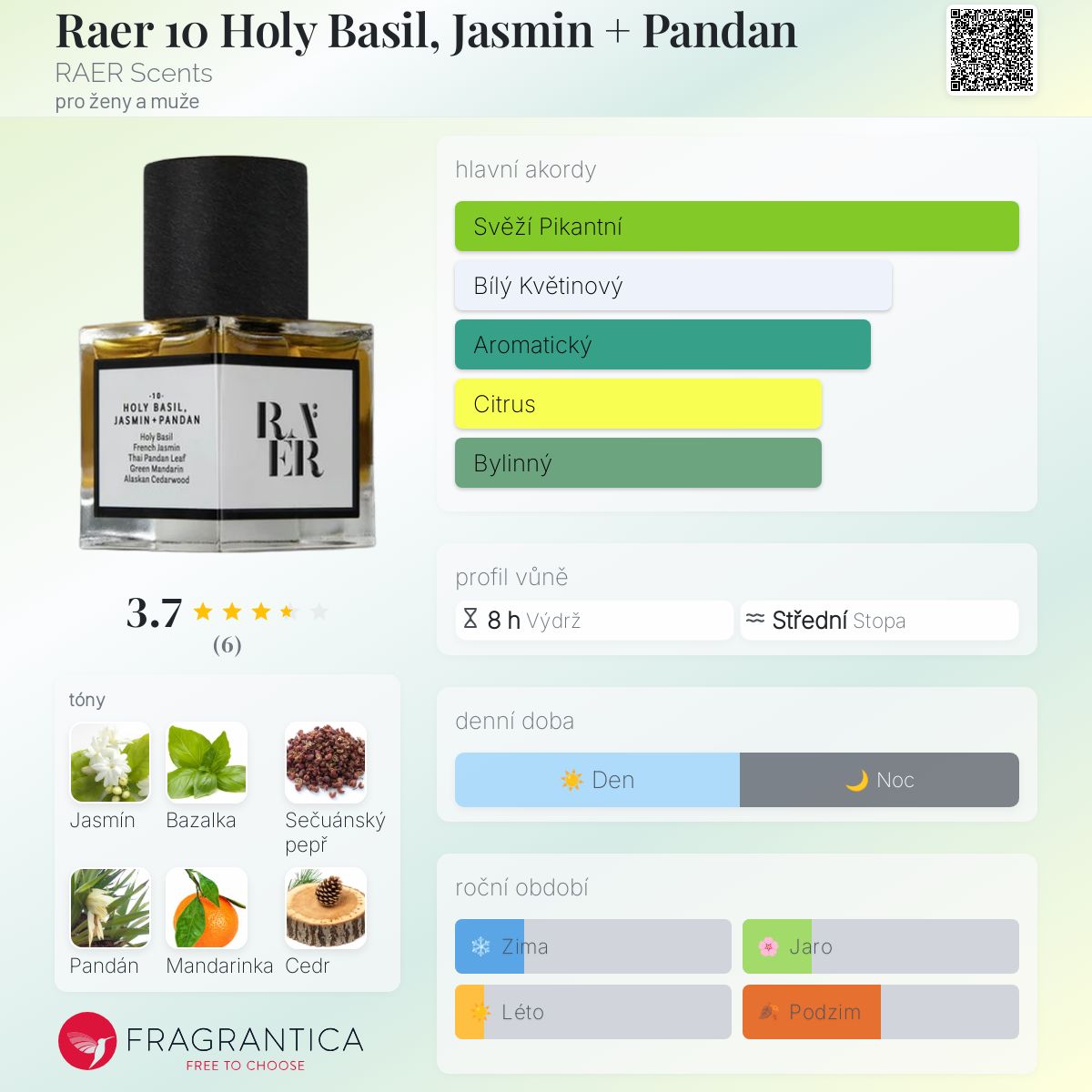 Raer 10 Holy Basil, Jasmin + Pandan podle RAER Scents je Woody Aromatic vůně pro ženy a muže. Toto je nová vůně. Raer 10 Holy Basil, Jasmin + Pandan byl/a uveden/a v roce 2025. "Nosem" za touto vůní je Ted Rohn.