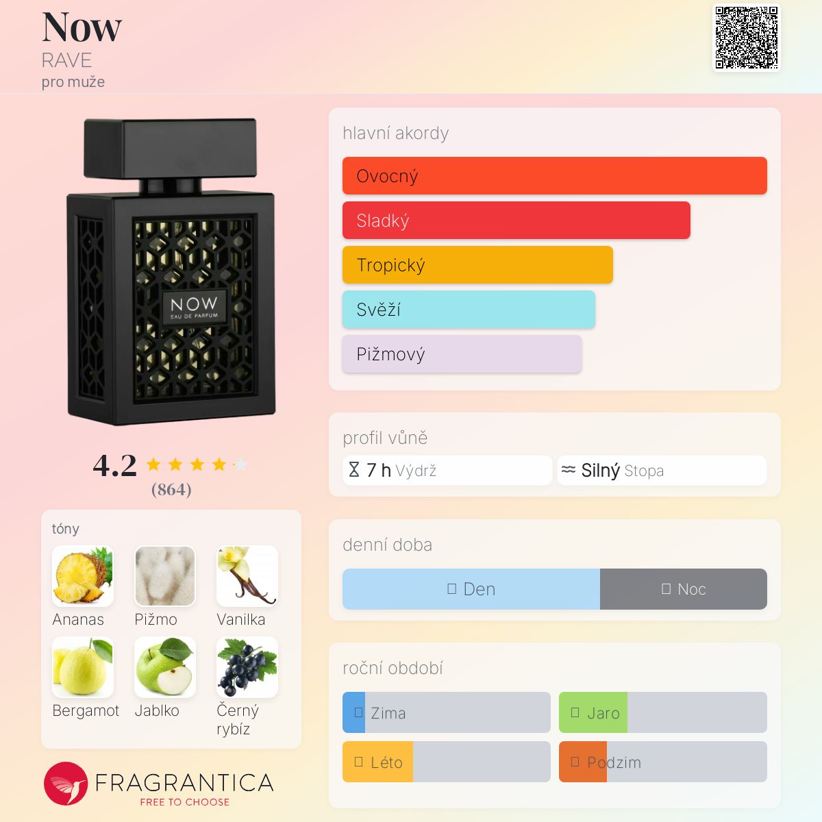 Now podle RAVE je Woody Aromatic vůně pro muže. Toto je nová vůně. Now byl/a uveden/a v roce 2022. Vrchní tóny jsou Ananas, Bergamot, Jablko a Černý rybíz; střední tóny jsouBříza, Pačuli, Marocký jasmín a Růže ; základní tóny jsou Pižmo, Vanilka, Dubový mech a Ambra.