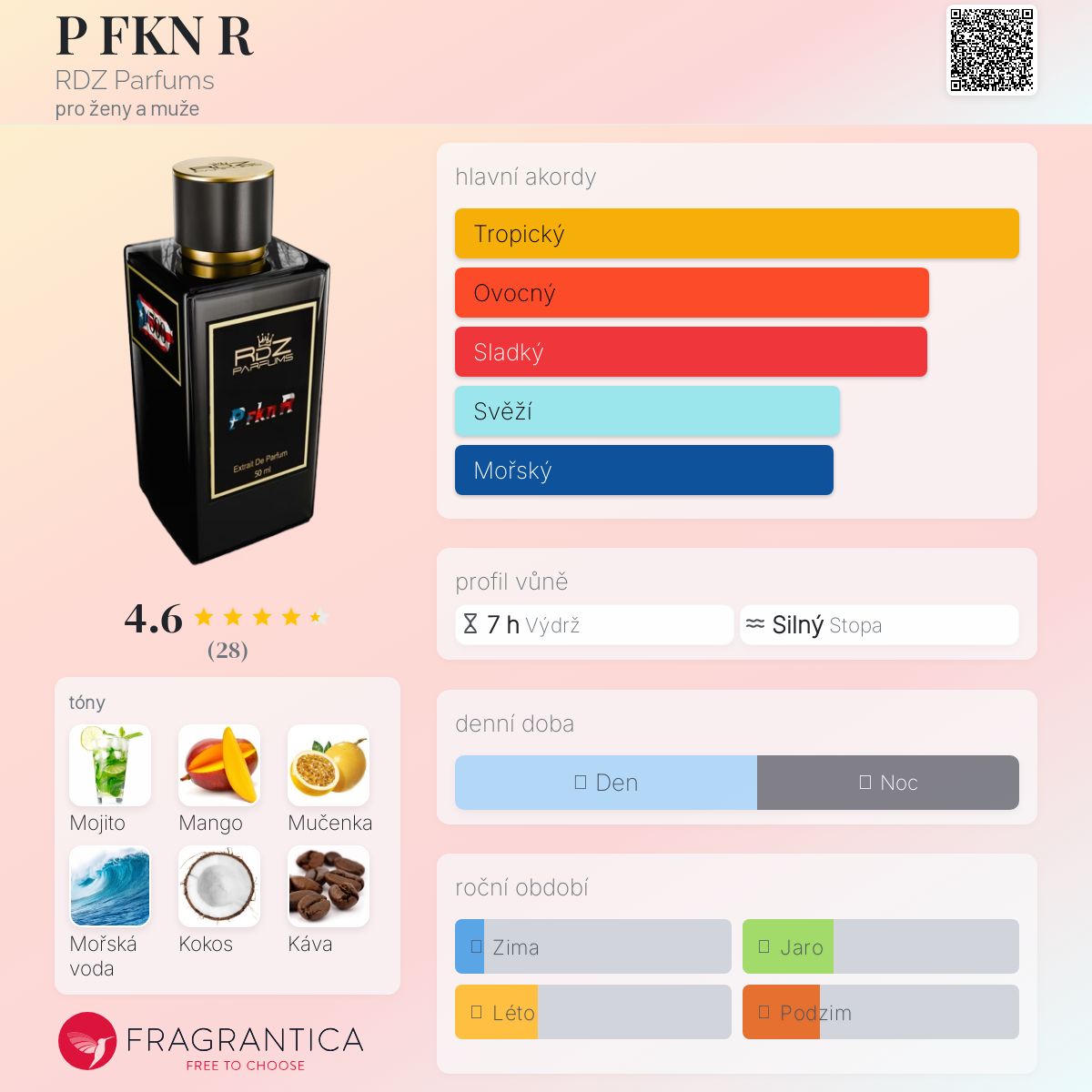 P FKN R podle RDZ Parfums je Aromatic Fruity vůně pro ženy a muže. Toto je nová vůně. P FKN R byl/a uveden/a v roce 2024. "Nosem" za touto vůní je Christian Carbonnel. Vrchní tóny jsou Mojito, Mango, Mučenka a Zelené tóny; střední tóny jsouMořské tóny, Kokosové mléko a Lilie ; základní tóny jsou Káva, Dřevité tóny, Pižmo a Jantar (ambra).