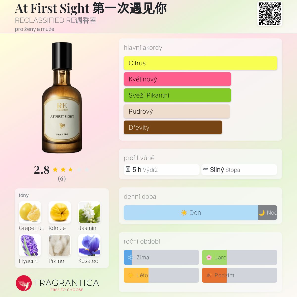 At First Sight 第一次遇见你 podle RECLASSIFIED RE调香室 je Citrus vůně pro ženy a muže. At First Sight 第一次遇见你 byl/a uveden/a v roce 2014. Vrchní tóny jsou Grapefruit a Kdoule; střední tóny jsouJasmín a Hyacint ; základní tóny jsou Pižmo, Kosatec, Virginský cedr a Jantar (ambra).