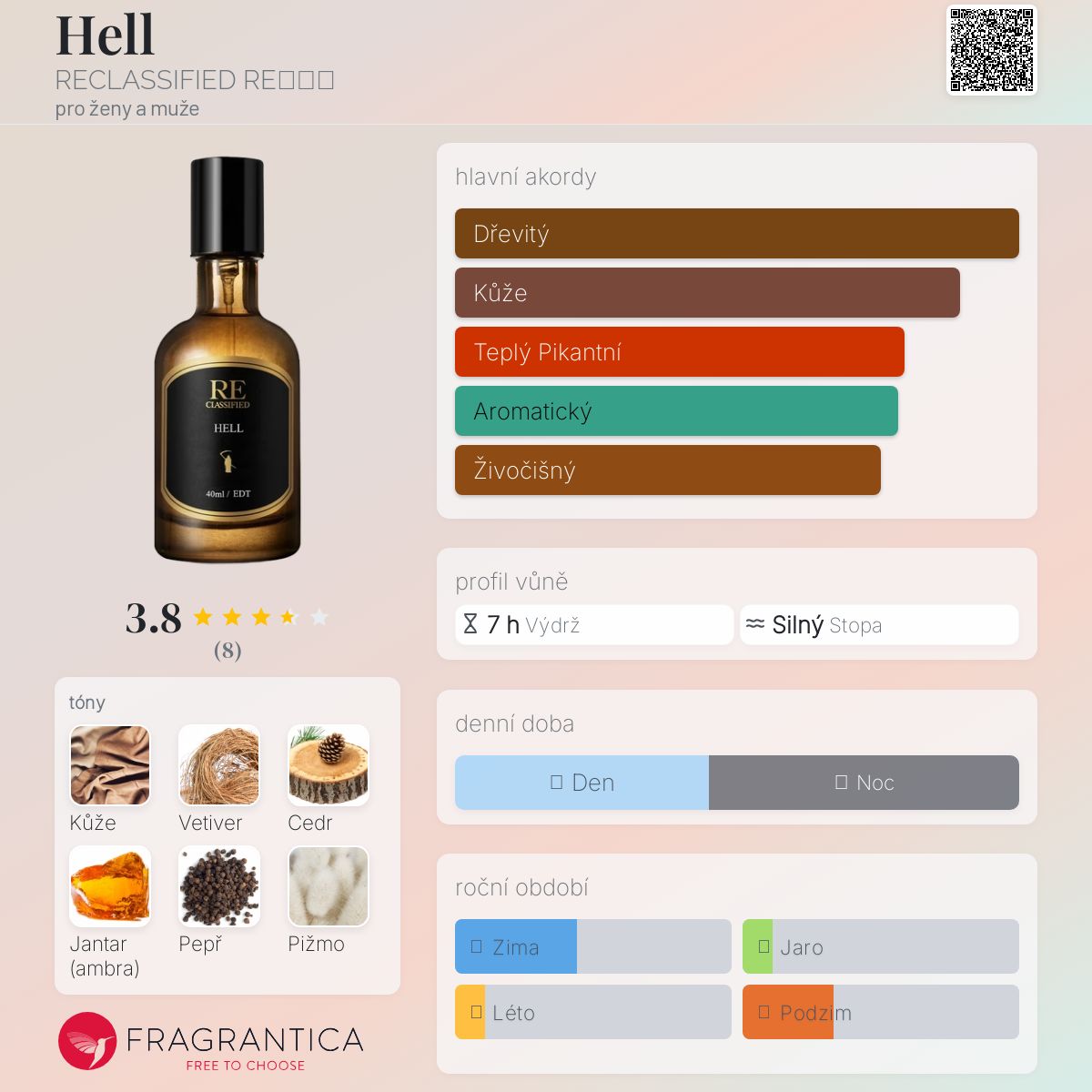 Hell 地狱 podle RECLASSIFIED RE调香室 je Woody vůně pro ženy a muže. Hell 地狱 byl/a uveden/a v roce 2014. Vrchní tóny jsou Černý pepř a Kardamom; střední tóny jsouCedr a Skořice ; základní tóny jsou Kůže, Vetiver, Jantar (ambra) a Pižmo.