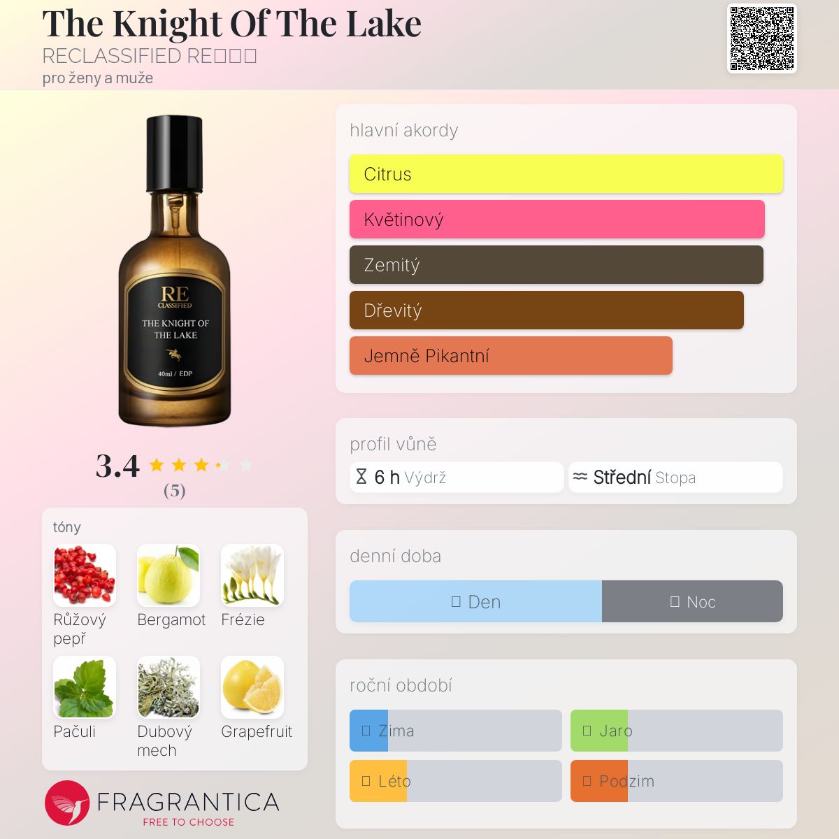 The Knight Of The Lake 湖上骑士 podle RECLASSIFIED RE调香室 je Woody vůně pro ženy a muže. The Knight Of The Lake 湖上骑士 byl/a uveden/a v roce 2014. Vrchní tóny jsou Růžový pepř, Bergamot a Grapefruit; střední tóny jsouFrézie, Kosatec a Brambořík ; základní tóny jsou Pačuli, Dubový mech a Vetiver.