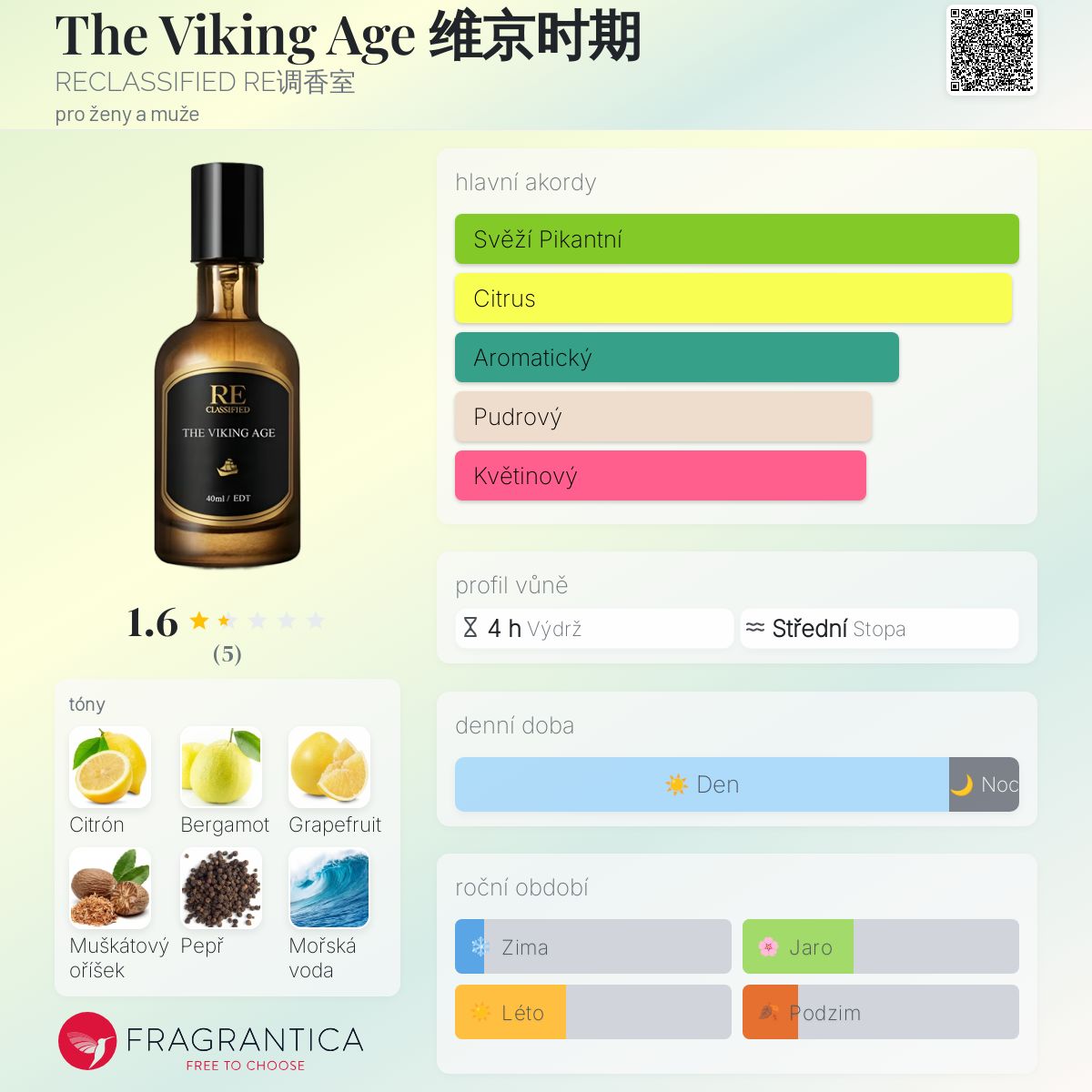 The Viking Age 维京时期 podle RECLASSIFIED RE调香室 je vůně pro ženy a muže. Vrchní tóny jsou Citrón, Bergamot, Grapefruit, Muškátový oříšek a Pepř; střední tóny jsouMořská voda, Lotus, Konvalinka, Levandule a Fialka ; základní tóny jsou Cedr, Jantar (ambra), Pižmo a Dubový mech.
