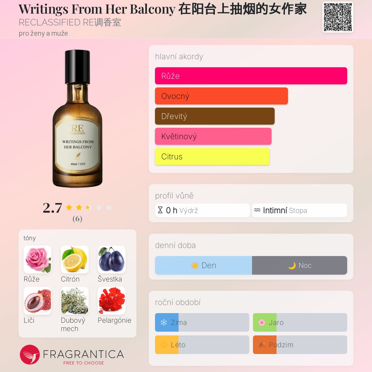 Writings From Her Balcony 在阳台上抽烟的女作家 podle RECLASSIFIED RE调香室 je Floral vůně pro ženy a muže. Vrchní tóny jsou Citrón, Švestka a Liči; střední tóny jsouRůže, Mech a Pelargónie ; základní tóny jsou Pižmo, Med a Dřevité tóny.
