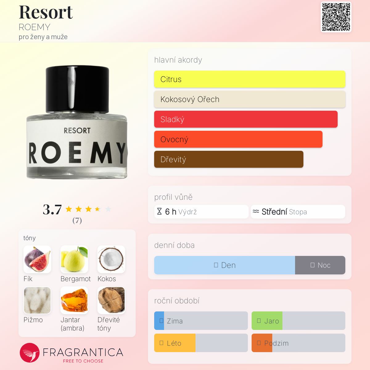 Resort podle ROEMY je Orientální vůně pro ženy a muže. Resort byl/a uveden/a v roce 2021. Vrchní tóny jsou Fík a Bergamot; střední tóny jsouKokosový nektar a Pižmo ; základní tóny jsou Jantar (ambra), Vzácné dřevo a Mech.