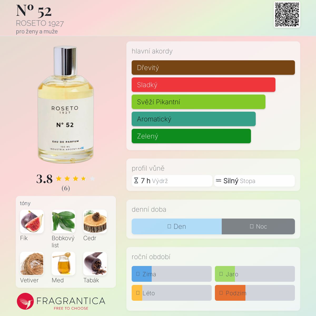 Nº 52 podle ROSETO 1927 je Woody Spicy vůně pro ženy a muže. Nº 52 byl/a uveden/a v roce 2021. Vrchní tóny jsou Fík a Bobkový list; střední tóny jsouVirginský cedr, Java vetiverový olej a Med ; základní tóny jsou Tabák a Seno.