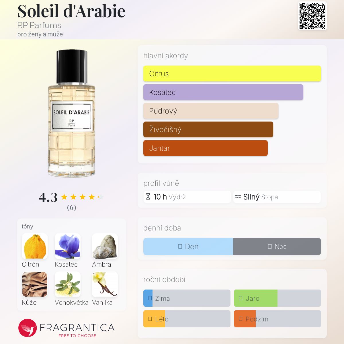Soleil d'Arabie podle RP Parfums je Floral Woody Musk vůně pro ženy a muže. Toto je nová vůně. Soleil d'Arabie byl/a uveden/a v roce 2024. Vrchní tóny jsou Citrón a Vonokvětka; střední tóny jsouKosatec a Ambra ; základní tóny jsou Kůže a Vanilka.