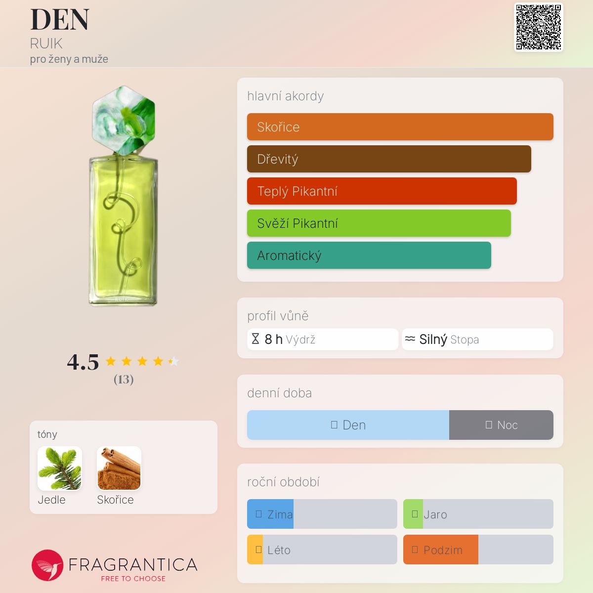 DEN podle RUIK je Woody Chypre vůně pro ženy a muže. DEN byl/a uveden/a v roce 2017. DEN byl/a vytvořen/a Noëlle Dorenbos a Boye Dorenbos.