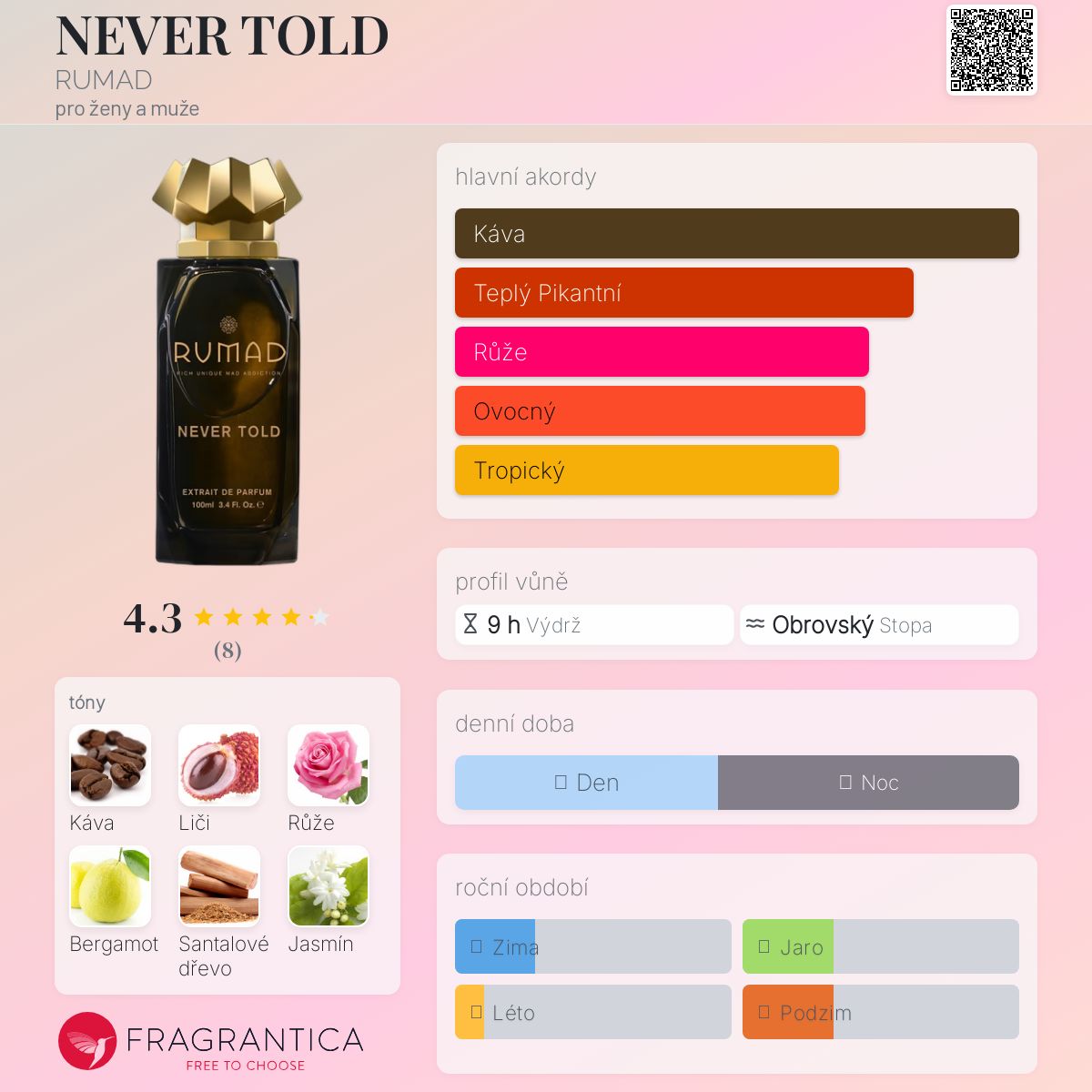 NEVER TOLD podle RUMAD je Floral Fruity vůně pro ženy a muže. Toto je nová vůně. NEVER TOLD byl/a uveden/a v roce 2024. "Nosem" za touto vůní je Serge Majoullier. Vrchní tón je Bergamot ; střední tóny jsouKáva, Liči, Turecká růže a Jasmín ; základní tóny jsou Santalové dřevo, Vanilka, Jantar (ambra) a Pižmo.